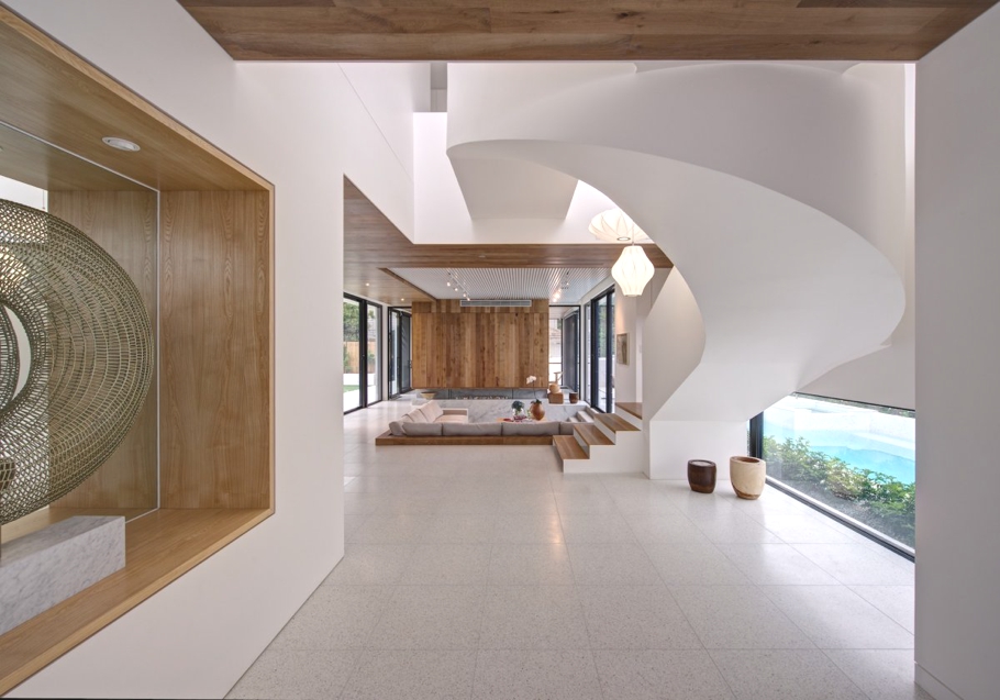 The space was treated from its genesis, with the same respect for design as a museum. Carving of ceiling, walls and floor not only creates sculptural partitions throughout the residence, but with the spirit of a rock pool, provides channels to flow through and delineates ample space in which to dwell together. The space also lends opportunity for personalisation to the clients aesthetics and lifestyle through decorative items and furnishings. The result is a harmonious sanctuary that stands as a finished work of art on its own, and is yet constantly evolving with its inhabitants.