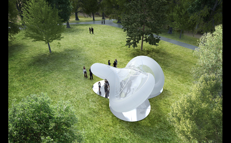 Peace is one of the highest human ideals. It is a state of equilibrium; It means no war, but also harmony, silence, pureness, kindness, happiness, appeasement, calm, reconciliation, serendipity, tranquillity… To express these ideas, they have created a perfect and symmetrical sculpture, obtained by a precise geometrical manipulation. The beauty of the shape lies in its perfect symmetry and fluidity of the pavilion.