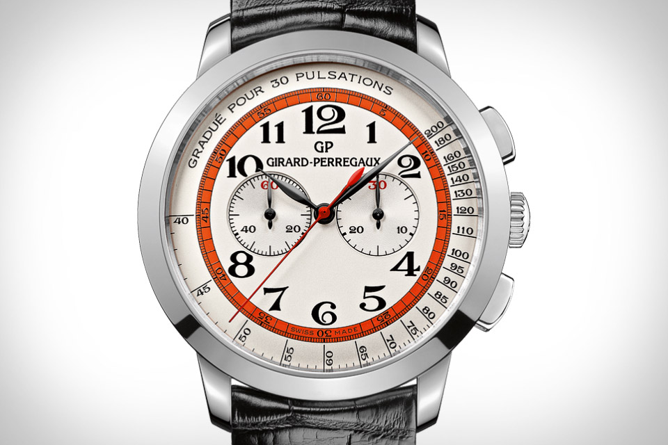 Girard-Perregaux is introducing a very limited edition version of its 1966 Chronograph meant to recall the doctor’s watches of the early twentieth century. Available exclusively from the Dubail boutique in Paris, it features a 40mm case, and automatic caliber movement, and face details like the bold orange/red circle, typeface, and pulsometer scale that set it apart from the company’s other 1966 chronographs.