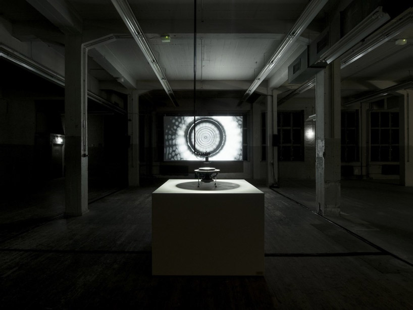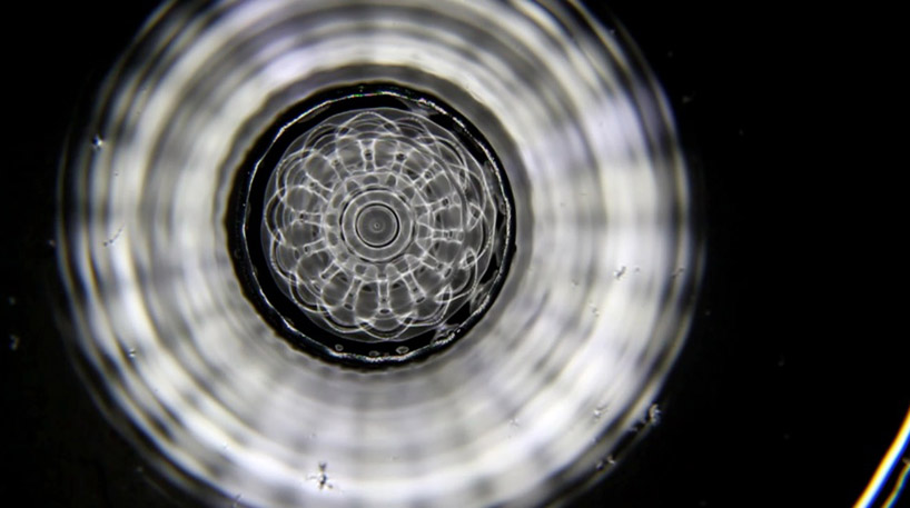 The fascination of ‘sonic water’ by media artists Sven Meyer & Kim Pörksen, is rooted in their ability to aesthetically express sound as a visual experience. The installation produces constantly transforming images which react when a user adds content to the liquid mix. Water in small containers act as flexible three-dimensional sculptures that translate sounds into kinetic imagery. Through the use of light and speakers, the water tanks produce wave patterns depending on different audible frequencies, reflecting on the process of changing chaos and order. By following the law of the golden section, the liquid soundscapes react like forces of nature, reproducing identical vibrational patterns found in the tones of the solar system. [Click on the picture below to watch the video.]