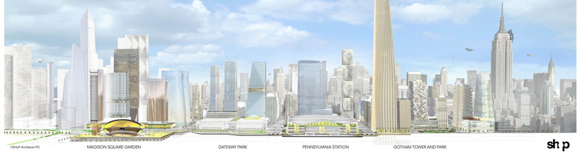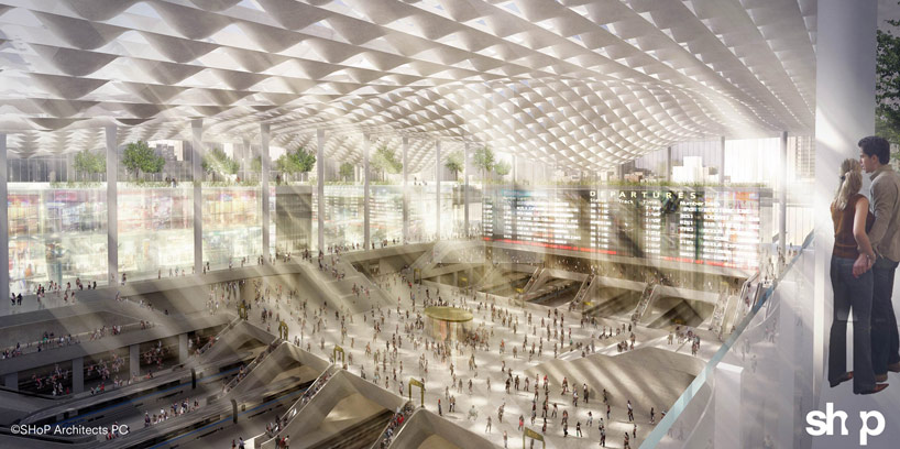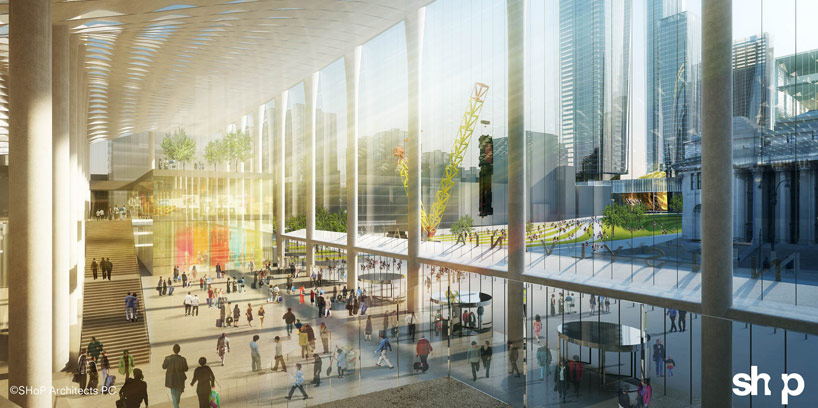 SHoP architects’ proposal transforms this historical New York hub into a bright, airy space in response to MAS’s 2013 design challenge for a new penn station and the next madison square garden. The design relocates the arena to Hudson Yards, engaging the waterfront, and extending the midtown locus across Manhattan. Further integrating it into the city context, an extension of the high line connects to the gotham gateway armature. Parks and amenities linking the former neighbors, provide a civic face to the project and generate revenues to relieve the financial burden. the displacement of madison square garden allows major conceptual renovations to re-contextualize transportation in the heart of New York. The design encloses the rail station with a dematerialized train shed, allowing ample light and air into the space. Circulation would be re-organized for ease of access and intuitive navigation throughout the largest transportation center in the united states.