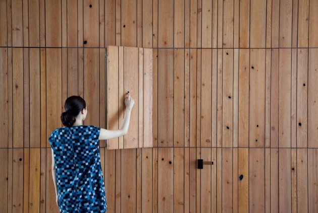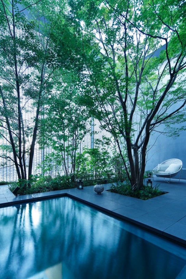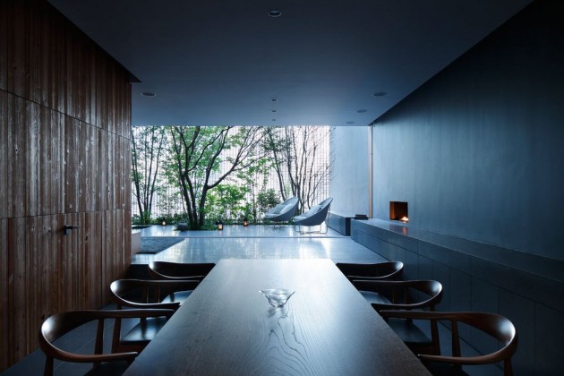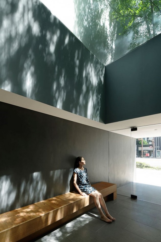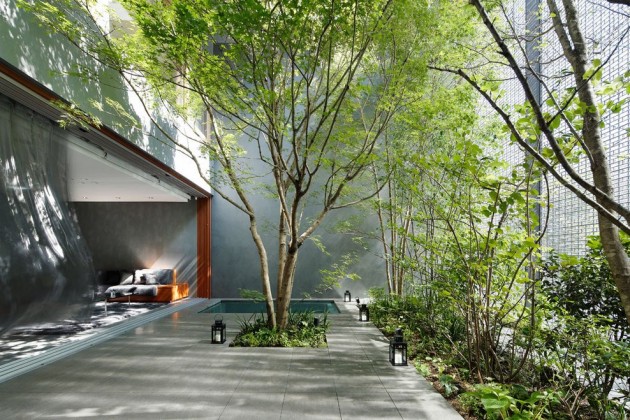 This house is sited among tall buildings in downtown Hiroshima, overlooking a street with many passing cars and trams. To obtain privacy and tranquility in these surroundings, we placed a garden and optical glass façade on the street side of the house. The garden is visible from all rooms, and the serene soundless scenery of the passing cars and trams imparts richness to life in the house. Sunlight from the east, refracting through the glass, creates beautiful light patterns. Rain striking the water-basin skylight manifests water patterns on the entrance floor. Filtered light through the garden trees flickers on the living room floor, and a super lightweight curtain of sputter-coated metal dances in the wind. Although located downtown in a city, the house enables residents to enjoy the changing light and city moods, as the day passes, and live in awareness of the changing seasons.