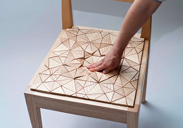 Annie Evelyn is a furniture designer who has been developing her unusual furniture upholstery techniques since she was a student. This collection of chairs, named “Squishy”, has been designed for Brooklyn-based company New Colony Furniture. Other Evelyn’s works in her portfolio display a sense of humor about seating, with an “impolite chair” boasting a built-in whoopee cushion, and a piece entitled “Sit on My Finger” that’s a tiny chair you wear as a ring. Evelyn reclaims wooden chair frames, lines the seats and backs with foam, and painstakingly covers these surfaces with small pieces of hard materials that give way when pressure is applied. With this technique, she’s able to make cracked cement, tiles and faceted pieces of wood into exceptionally comfortable seating surfaces. Instead of poking you, those sticks will cradle the curves of your body.