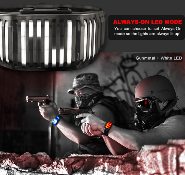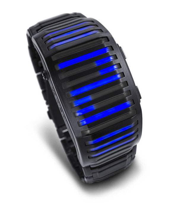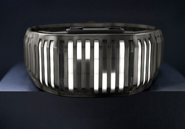The digital time presented in a new and innovative form, Kisai Neutron features sub-surface LED light bars that curve around your wrist like a time piece from the future. A customizable design, you can choose whether the watch displays the time by pulsing in & out or waving up & down. Integrated motion sensor technology means you can activate the display with a flick of the wrist or at the touch of a button. Kisai Neutron is very easy to read. Touch the button and four digits of time will appear on the display. These indicate the time in your choice of 12 or 24 hour format. Depending on whether you choose fade mode or wave mode, the digits will pulse in & out or wave up & down. Touch the lower button and the date is displayed in the same way in your choice of DD/MM or MM/DD format.