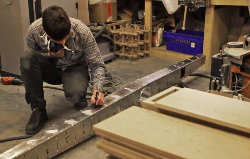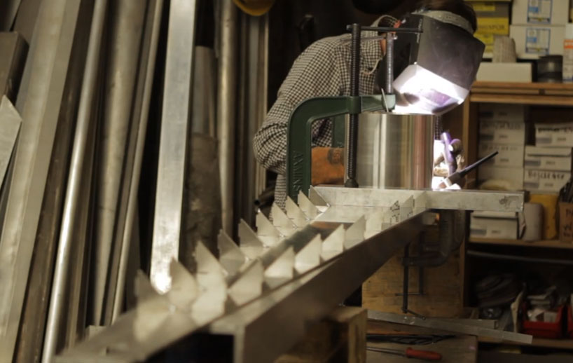 British artist Conrad Shawcross has turned the London roundhouse into a real-time clock. The installation, ‘timepiece’ is a modern-day mechanical sundial, which transforms the entire room into a time telling system, responding to the circular architecture in a dramatic display of light and shadow. The 8-meter, faceless clock functions from a rotating metal mechanism which hangs from the center of the ceiling. Its three mechanical arms, each with a glaringly bright bulb attached to its end, rhythmically swing and fold. positioned on the floor, marking the center point of the space, is a four-meter high gnomon — the pointed needle of a sundial — which signals the time. As the illuminated motor whirls, the light it casts onto the ground marks the hours, minutes and seconds in real time. shawcross developed the idea behind the mechanical light sculpture with the realization that he could adopt the roundhouse’s architectural elements into a timekeeper, paralleling its 24 iron columns to the number of hours in the day. The chiaroscuro that defines the piece brings the idea of timekeeping back to the participatory, celestial experience it once was.