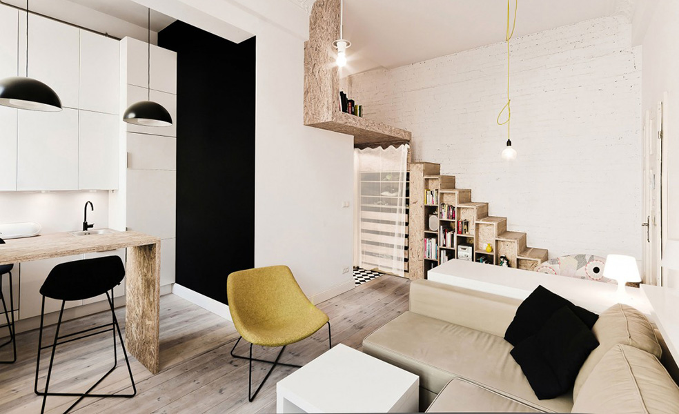 As the name suggests, “29 square meters” is an apartment which covers exactly that amount of space (roughly 312 sq ft). Located in Wroclaw, Poland, the tiny home has been efficiently maximized by local architecture firm 3XA, who added a semi-mezzanine (an entire second floor level was not possible due to the restricting 12ft ceilings) above the bathroom and hallway, allowing for a rather spacious sleeping area. Below, the living room, kitchen and dining area were all knocked into one open-plan space, giving a sense of freedom and airiness. Additionally, to deceive the senses, a door leading to nowhere was added to one of the walls.