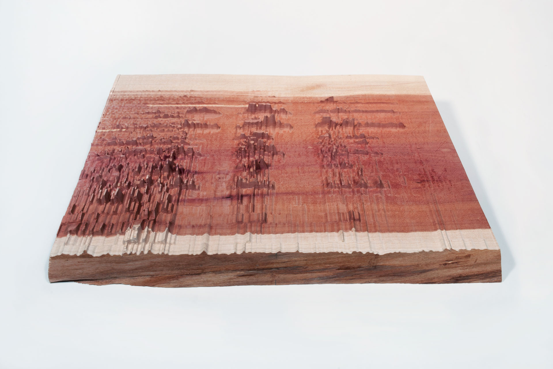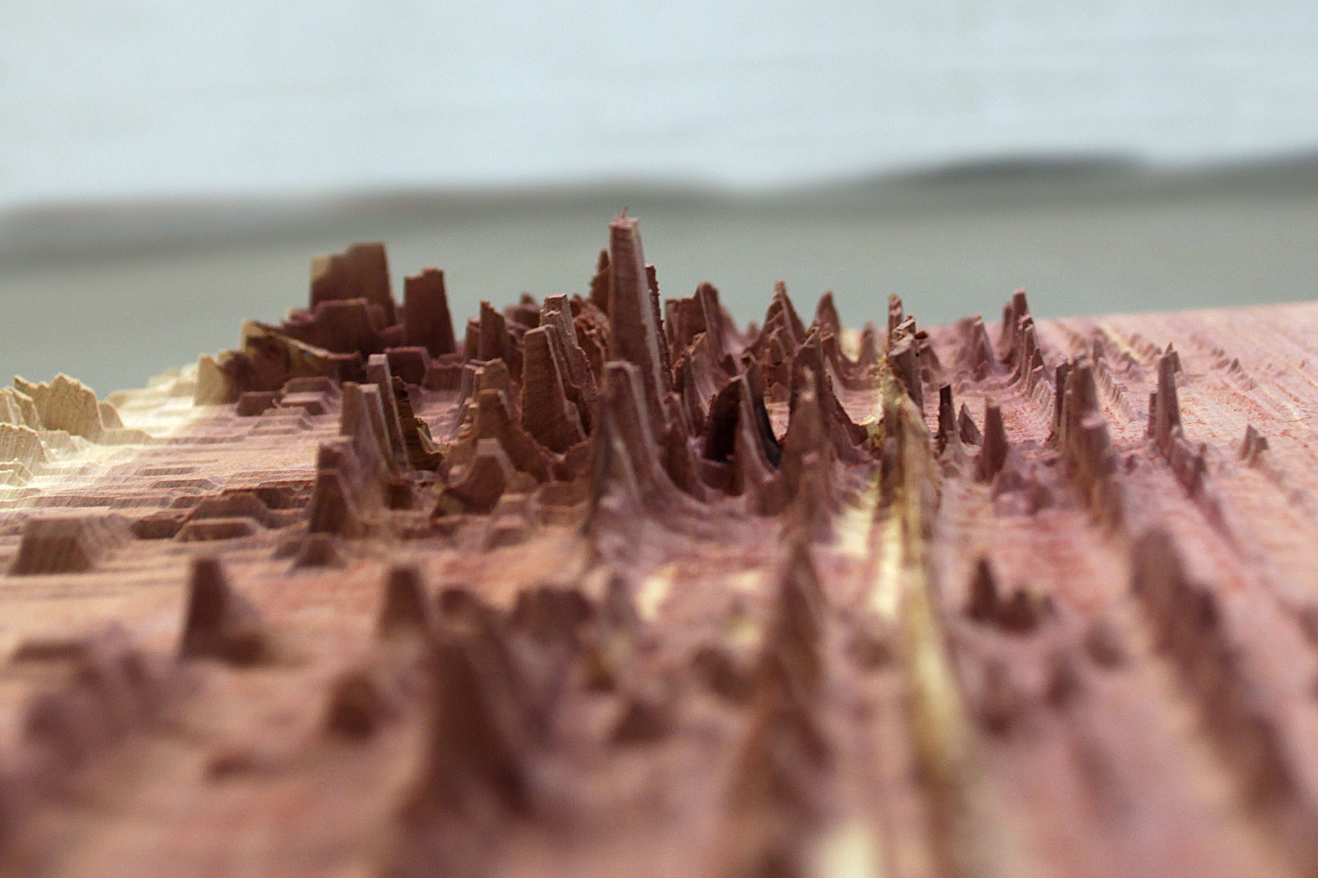 Spectral Density Estimation is a pair of sculptures commissioned by the SECCA and the Winston-Salem Symphony orchestra. Two sound recordings of the first organized tuning were taken at the last 2 orchestra performances of the 2012 / 2013 season. Each recording was analyzed and transformed into a spatial arrangement of the audio frequencies over time. The resulting geometry was then carved into a block of wood from a cedar tree, that had fallen outside the museum.