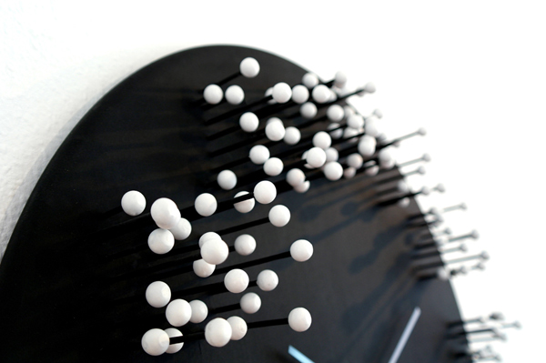 Check out this very interesting wall clock MOCAP designed by J.P.Meulendijks Design Studio. When standing in front of this bamboo wall-clock, its numbers are clear and visible, but walk around it and you’ll notice that they slowly dissolve, falling apart in a vague white fuzz. Inspired by the movie industries motion capture technology, this striking optical illusion is created by small, white balls that extend various distances from the matte black surface on pegs of the same color and appear to float effortlessly in the air.