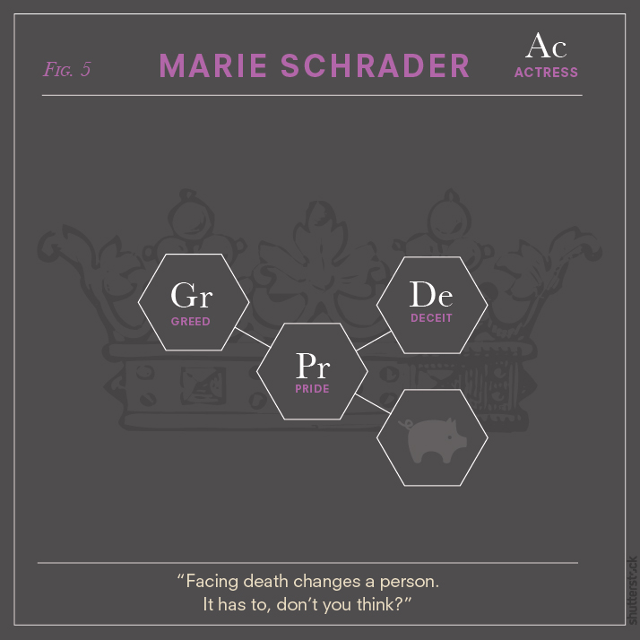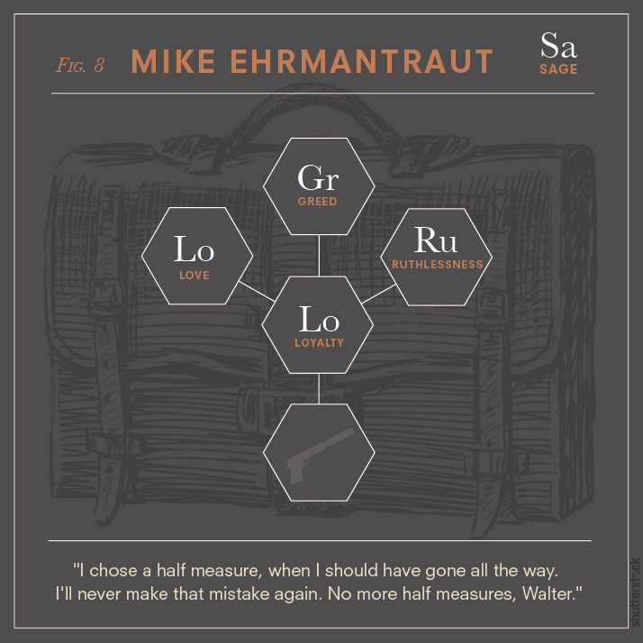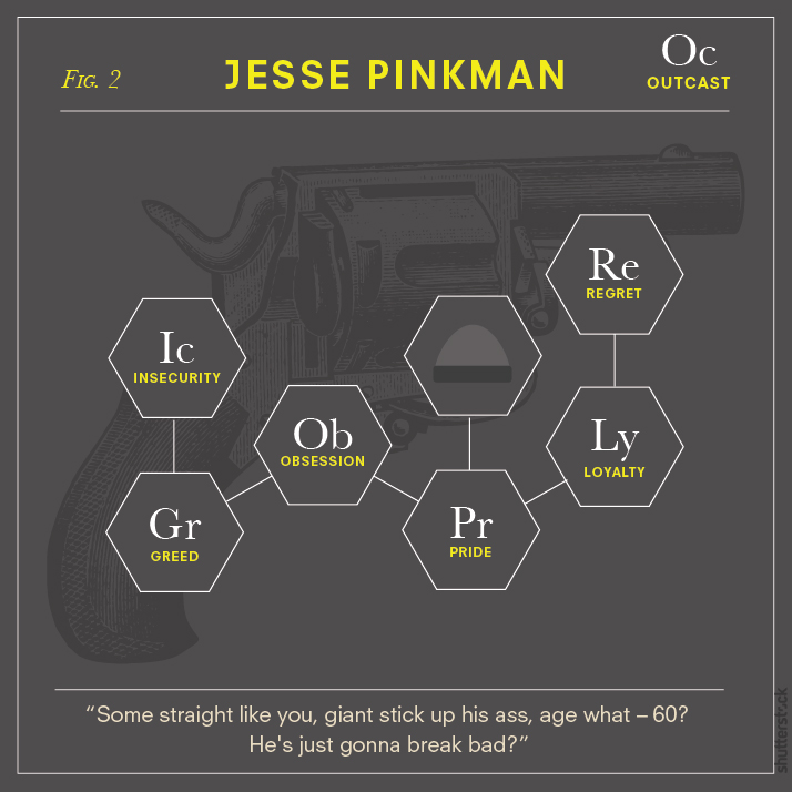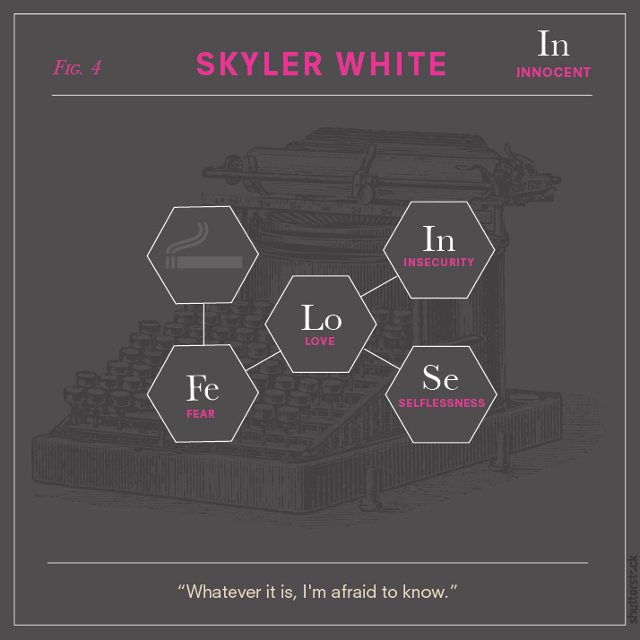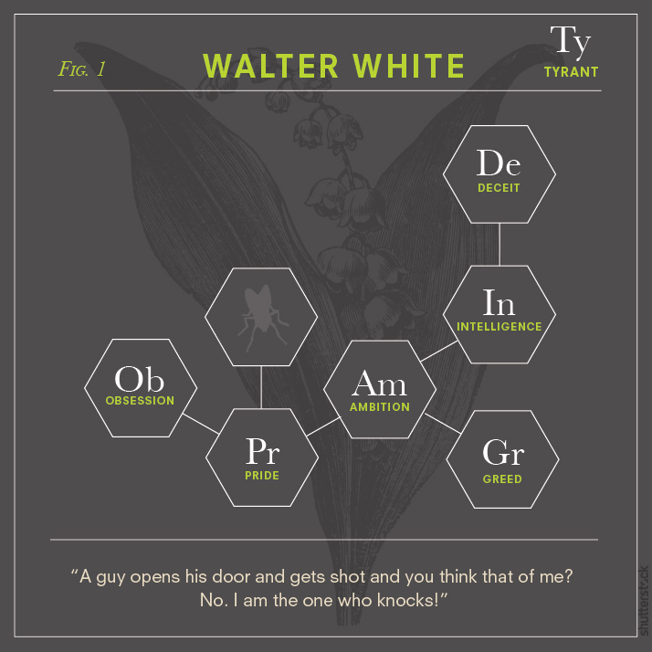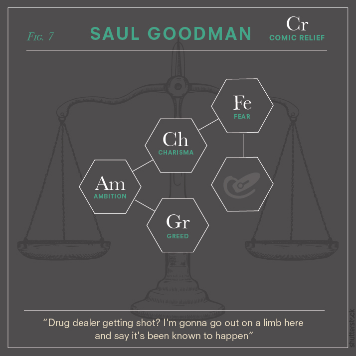 For true fans of the show, every minute “element” in each diagram is sure to spark a memory of that character’s narrative and personal journey. While some visual symbols like the scales of justice seem an obvious fit for Saul Goodman (solely because he’s technically a lawyer), the fly in Walter’s structural formula is a nod to a notable episode titled Fly, which symbolizes the loss of control in Walter’s life as his cancer is in remission yet he continues to cook meth. The flower in his frame is also a reminder of the poisonous “Lily of the Valley” plant that reflects one of the many shifts in Walter’s moral compass.