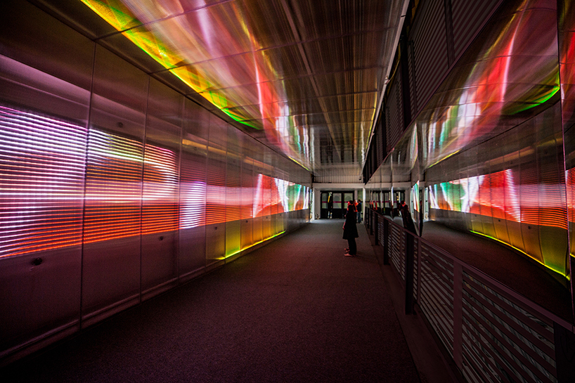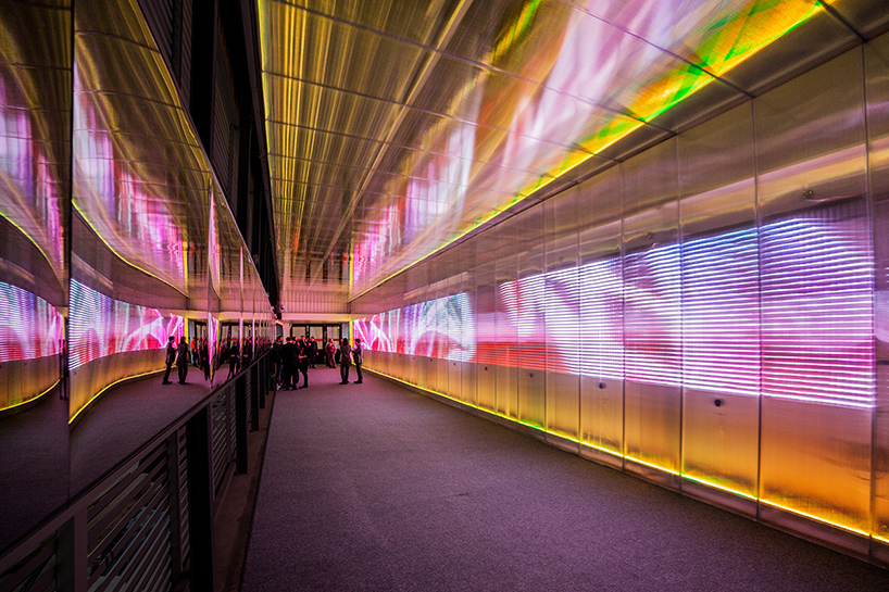 Using LED technology ‘the pixels crossing’ by french designer miguel chevalier is a sensory artwork completed in collaboration with traffic and sound composer Michel Redolfi. Installed inside the temporary tunnel, connecting the Forum des Halles and the Place Carrée in Paris, the light piece features successive, multicolored graphical scenes that harmoniously follow to a musical rhythm. A cadenced wave pattern of sound palpitates from the walls with light diffracting within the alveolar polycarbonate panels. Spanning along the 40m tunnel, the 4m high sensory artwork enriches pedestrian’s experience as they walk along the transit route transforming a regular tunnel into a magical and contemporary passage.