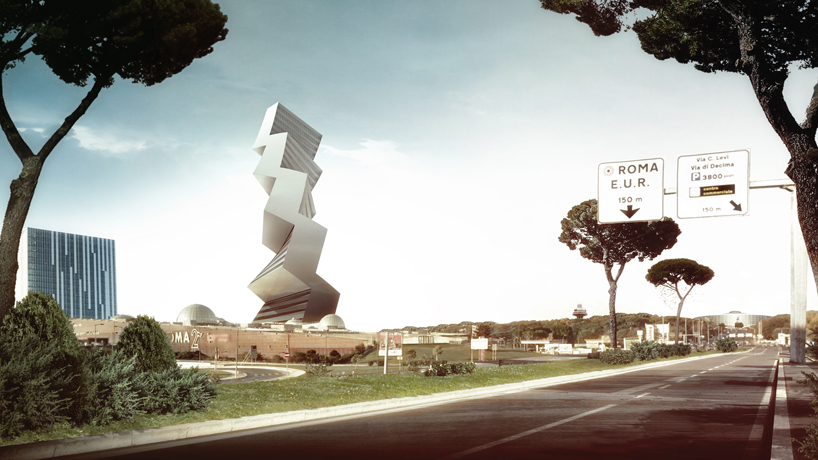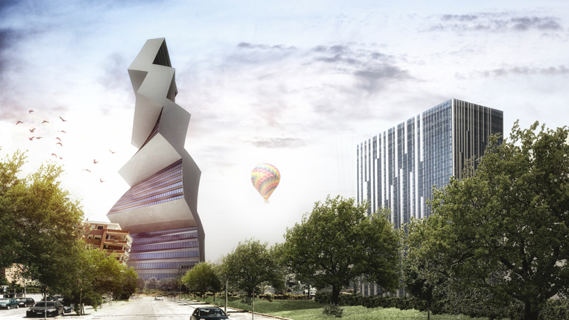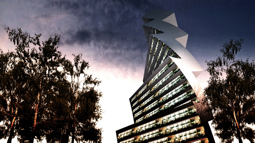 Disagreeing with the ‘Eurosky Tower’ by Franco Purini, located in a modern area on the outskirts of Rome, italian architects paolo venturella + angelo balducci have delivered an alternative concept. Examining the idea of ‘integration’ between architecture and renewable energy, the architects offer a radically different shape for the same building called ‘the twilt tower’ the name is based on a combination of the words ‘twisted’ and ‘twilted’. The tower integrates photovoltaic panels not just on the roof but evenly across the volume, dictating its form. The tilting and rotating of the panels towards the sun’s rays, allows for direct sun radiation throughout the whole day.