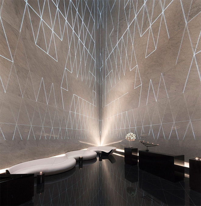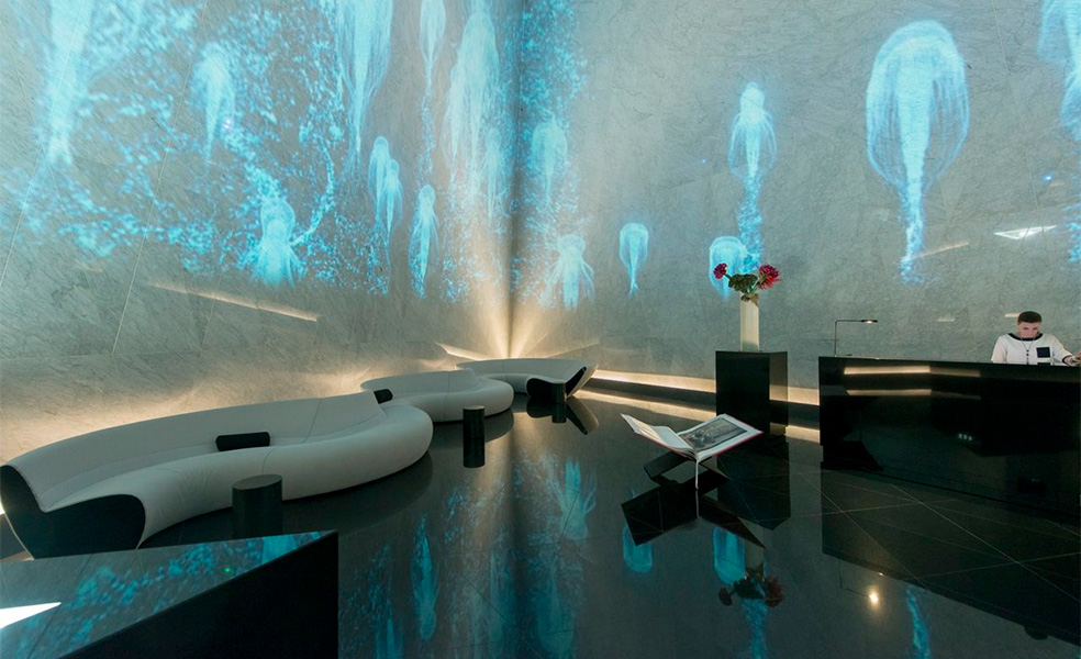 “The project is the first hotel in which everything, from the shell of the building to the bathroom fittings, has been designed by Foster + Partners. As a result, the drama of the interior spaces is provided by the bold geometry of the structure – the challenge for the design was to complement and not detract from, the 80 foot high top-lit space. The minimal furnishings were custom-made and include a 30-metre long curving bench, sleek black reception desks and a freestanding triangular champagne bar. Rather than works of art that interrupt the space, the projections celebrate its scale – giant jellyfish rise upwards as if from the depths of the sea, and the triangulated panels of the marble cladding are illuminated and animated like origami.” say the UK and International Restaurant & Bar Design Awards.