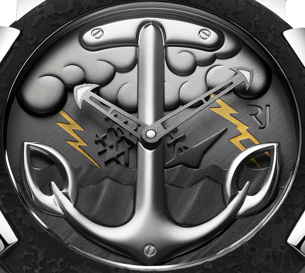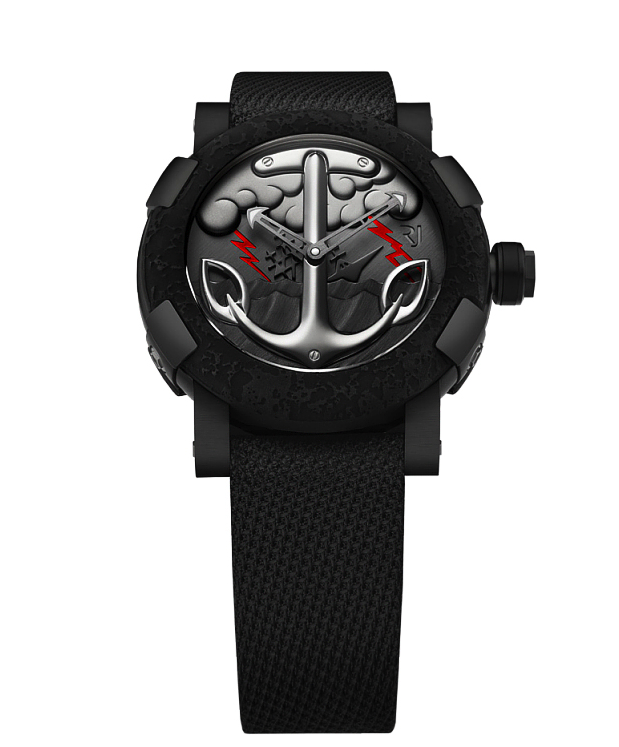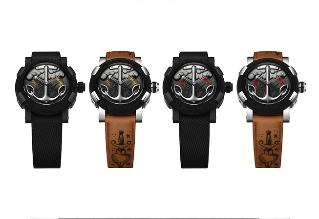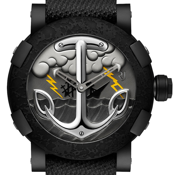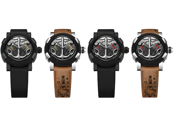 Romain Jerome’s “DNA” watches have been inspired by fascinating events and achievements from human history, regardless of whether they happened on land, at sea or in the skies. For the new “Tattoo-DNA” collection they spiced up this idea with a unique collaboration, as the brand worked together with Mo Coppoletta, founder of world-famous London-based tattoo studio The Family Business. The Tattoo-DNA collection will consist of four models, each issued in a limited series of only 25-pieces. All of them will be dressed in typical Romain Jerome fashion. That means a 50mm stainless steel case with four “paws” and a black PVD-coated, oxidized bezel that provides a rugged, ‘used’ look to the watch. Of the 100 watches in total, 50 will have black PVD-coating on the four “paws”, the crown and the lugs and these will come on a black fabric strap. The other fifty will have more bare stainless steel elements and a skin-colored leather strap, tattooed by the artist himself. The movement inside is the self-winding RJ001-A (basically an ETA 7750 with no chronograph or date function), beating at 28,800 with 42 hours of power reserve.