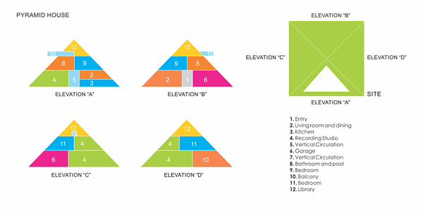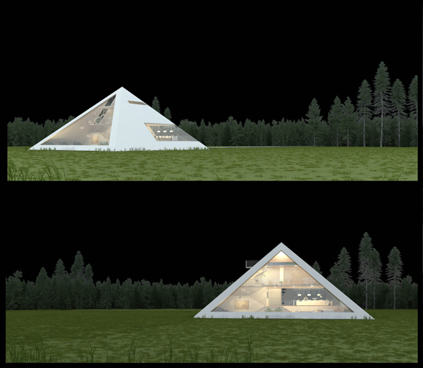 The simple geometric shape of this conceptual pyramid-shaped home creates a clean aesthetic, while remaining extremely eye-catching due to its iconic though rarely applied form. Some highlights of this design are the multiple windows cut out of the four large triangular facades that allow natural light into the home. An enormous window covers one entire side of the structure that visually exposes and lightens the design. Viewers also get to see inside the modern multi-level interior which features a library, balcony, two bedrooms, and even a recording studio that have all been cleverly sectioned to fit inside this unconventional concept.