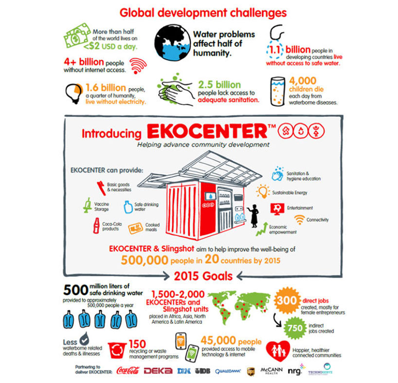 To help provide communities in need with access to safe drinking water and other basic necessities, the coca-cola company, together with DEKA R&D have launched ‘EKOCENTER’ – modularly designed kiosk, which has been transformed from a 20-foot shipping container – with the ‘slingshot’ water purification system housed within a community center. The initiative aims to improve the holistic well-being of developing communities around the world, focusing on those within the ‘bottom of the pyramid’, the largest, poorest socio-economic group – representing nearly 4 billion people who live on less than us$2 per day. EKOCENTER is a modularly designed kiosk with ‘slingshot’ technology at its core, transformed from a shipping container with solar panel awnings into a local community hub, offering clean, safe drinking water, alongside other services, such as access to wireless communication, electricity, vaccination storage, and more tailored to address community needs. The ‘slingshot’ water purification system developed in partnership with DEKA R&D – uses vapor compression distillation technology to turn any source of dirty water – river water, ocean water and even raw sewage – into safe, clean drinking water. The system delivers approximately 800 liters of clean water daily at the hourly electricity cost of less than a standard handheld hair dryer (1kwh).