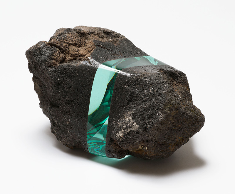 Born in Tokyo, Dusseldorf-based artist Ramon Todo creates beautiful textural juxtapositions using layers of glass in unexpected places. Starting with various stones, volcanic rock, fragments of the Berlin wall, and even books, the artist inserts perfectly cut glass fragments that seem to slice through the object resulting in segments of translucence where you would least expect it.