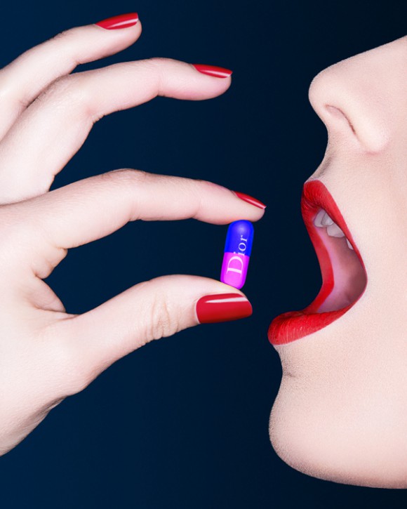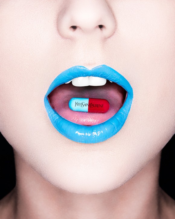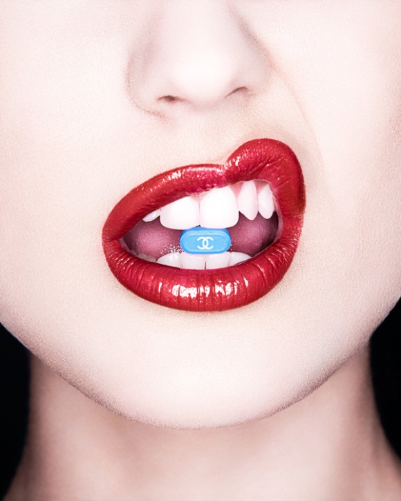 Steve Kraitt is a photographer and according to him a good photograph is like a good joke : if you had to explain it, it just isn’t that good. Respecting this principle, Steve Kraitt gives us his last photoshoot entitled “Designer Drugs” without further explanation. In these photos, starred the model (especially her lips) Echo Nittolitto. So, Designer Drugs show a contrast between the white teeth and the colored lips of Echo Nittolitto, a variety of pills and tablets stamped the biggest luxury brand : Chanel, Prada, Gucci, YSL, Dior… The artist may be trying to expose the addiction of some people to luxury brands and what they represent, the desire for recognition and a higher social status.
