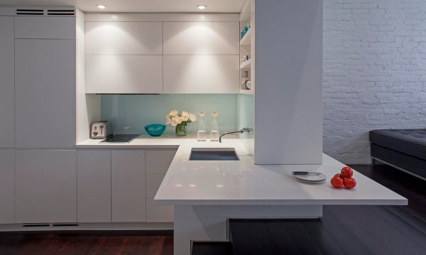 It’s really hard to make 425 square feet look spacious but Specht Harpman Architects managed to do just that in this once awkward New York City apartment that’s set at the top of a six-story building. By creating living platforms, they were able to accommodate all the necessities an apartment might need while keeping the space open and bright. Helping with that was the fact that they were working with over 24 feet of vertical space, making it possible to create the multiple layers of rooms. The compact bathroom is hidden away on the bottom floor beneath the staircase. While the kitchen is small, it remains open to the living room. They kept the cabinets and countertops white which helps keep it bright and airy. Every detail was kept simple as not to overwhelm the tight quarters and it really appears larger than the actual square footage. Up the first set of stairs you have the bedroom layer which seems to almost float above the living room below.