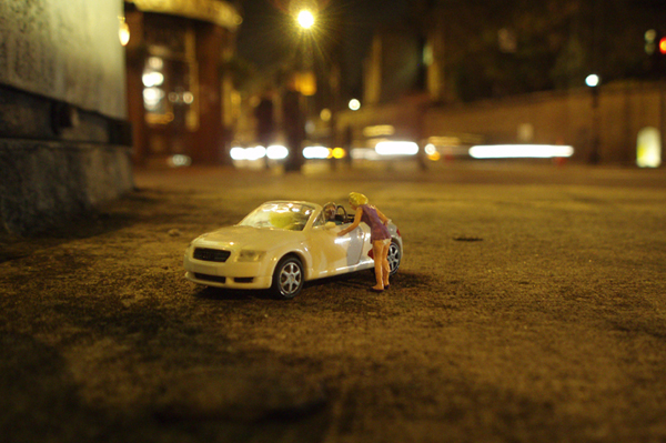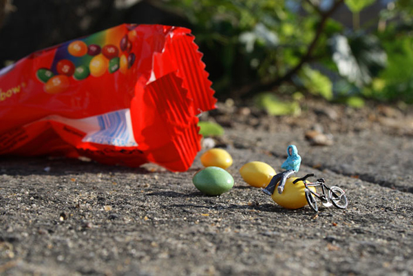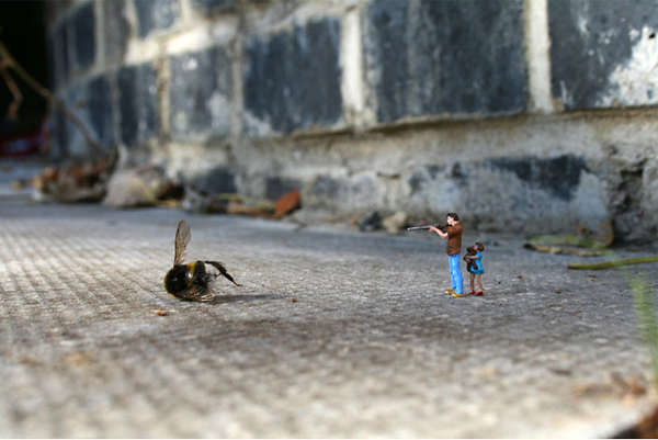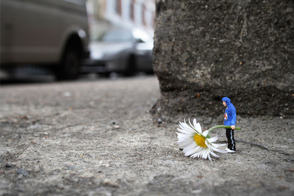 Slinkachu is as a London-based artist who creates very small street-based installations and then photographs them. He modifies tiny human figurines from model train sets and places them in real urban situations, capturing them sight-seeing, camping, grocery shopping, fighting and dying. Slinkachu creates tiny scenarios that, seen from afar, are almost unrecognizable, but when viewed up-close unveil an almost-hidden alternate reality.