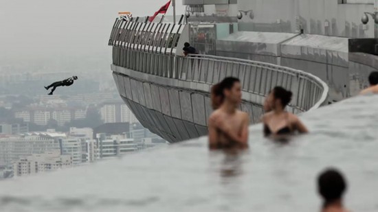 What could make the view from the infinity pool atop the Marina Bay Sands casino, soaring some 55 stories above Singapore, even more surreal? Human bodies jumping off of the roof behind you. Singapore have indicated the city-state is not synonymous with taking bold risks, which is perhaps why a stunt-spectacle like base jumping was chosen to promote the casino. Click on the picture above to watch the video.