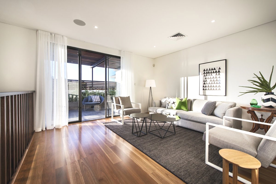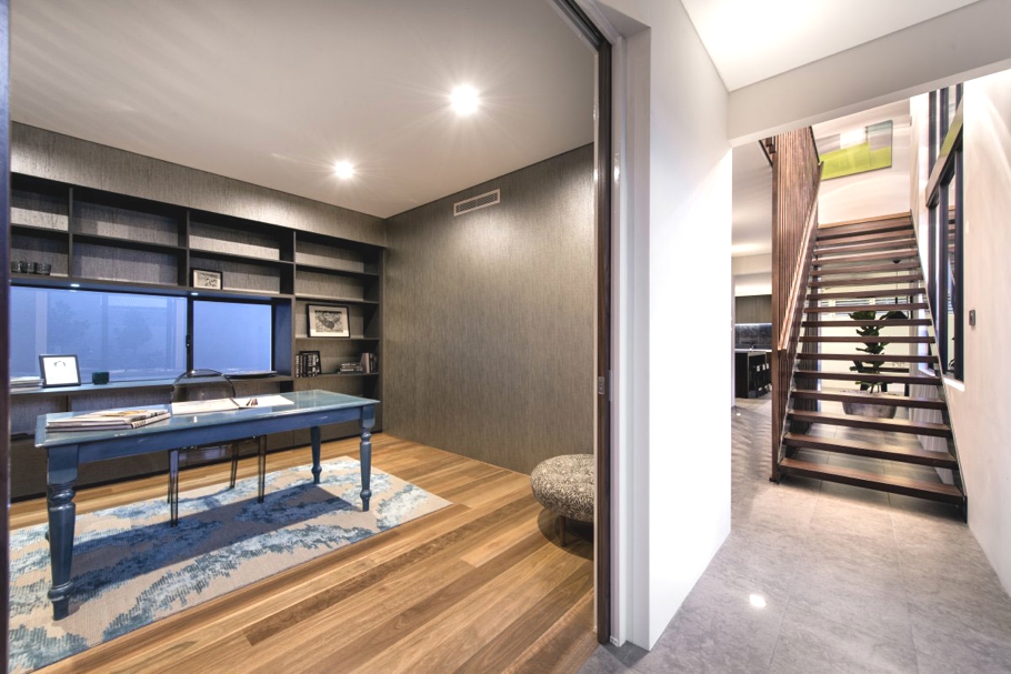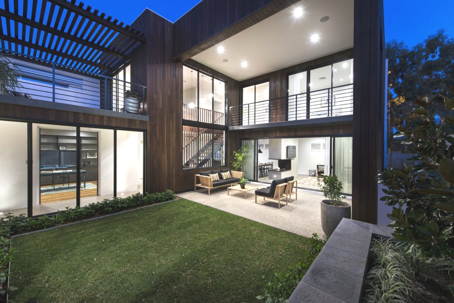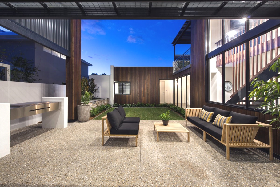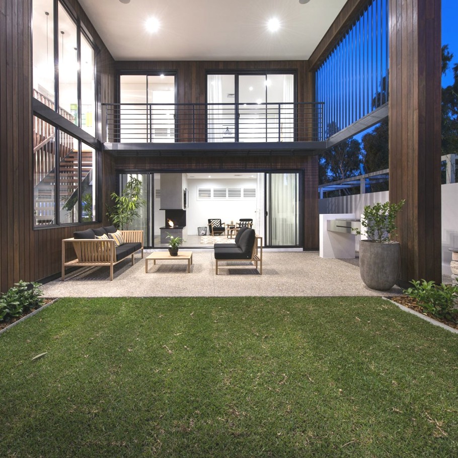 Light, volume and space were the primary influences behind this passive solar designed residence. Solar access to the front and a busy road to the rear drove the creation of a central courtyard with two story alfresco and mezzanine walkway which formed the focal point of the home. The mixture of timber and stone complement the metal work and concrete giving the home a warm industrial interior design edge. The free form living area features a central polished plaster ethanol fireplace and is adjacent to the state of the art kitchen with a concealed cool room and pantry. The remainder of the ground floor is comprised of a library, powder room, laundry and a separate master wing with dressing room, ensuite and private courtyard. Designed for multi-generational living, the upper floor has a separate living room and balcony which overlooks the stairwell and courtyard beyond. Both upper floor bedrooms access the mezzanine walkway and have a shared bathroom and separate kitchenette.