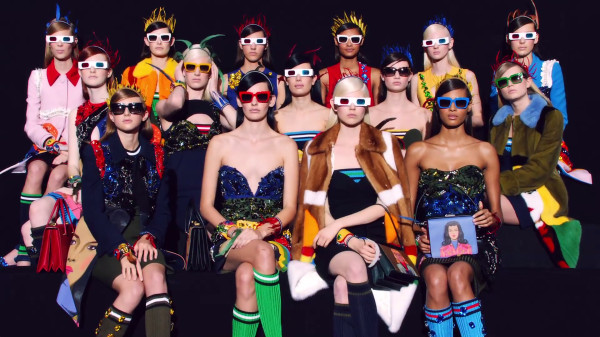 This season’s Prada video shows off the Steven Meisel-shot stars of the Spring-Summer 2014 campaign as slickly dressed fashion spectators. The stylish cast of up-and-coming models act out a series of imaginary events, from sports to movies, to concerts. It starts with a game of imaginary tennis, complete with candy pink balls and homemade sound effects, before moving to a movie theater with 3D glasses and colored popcorn.