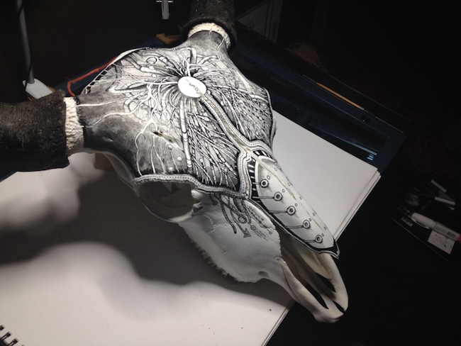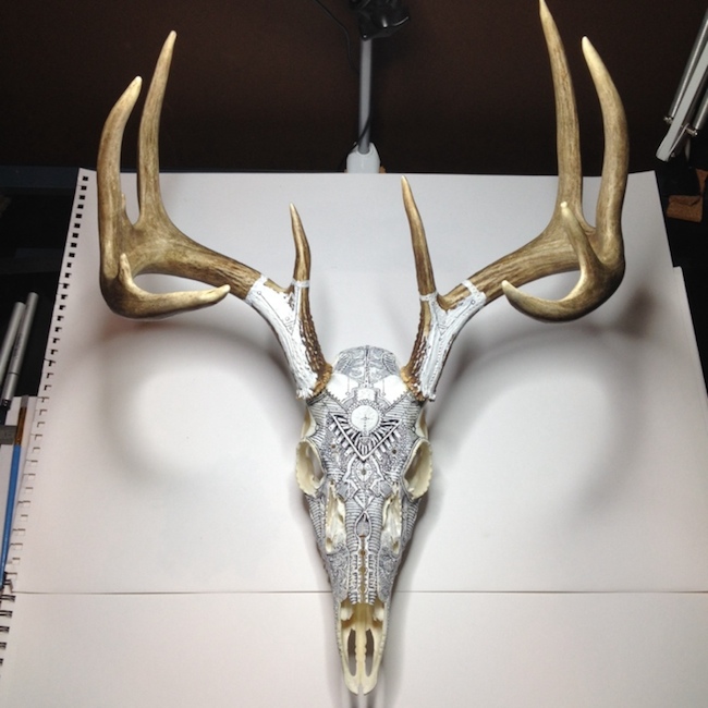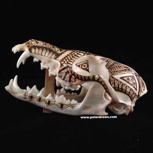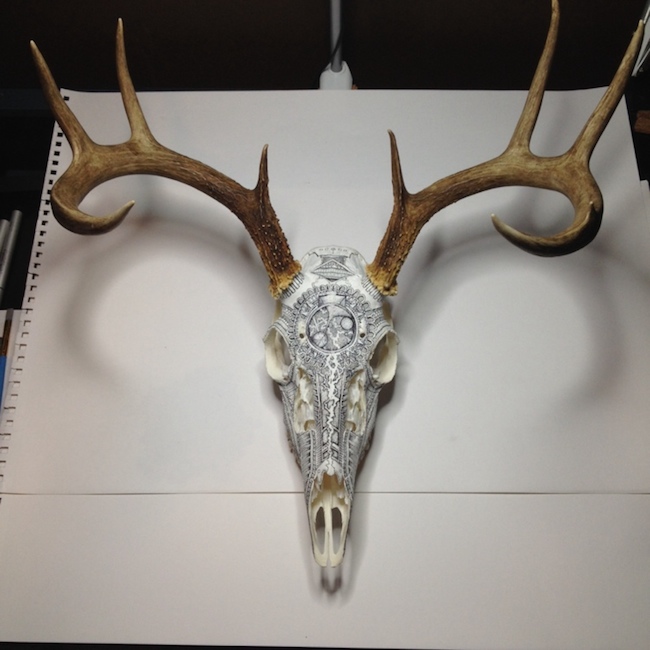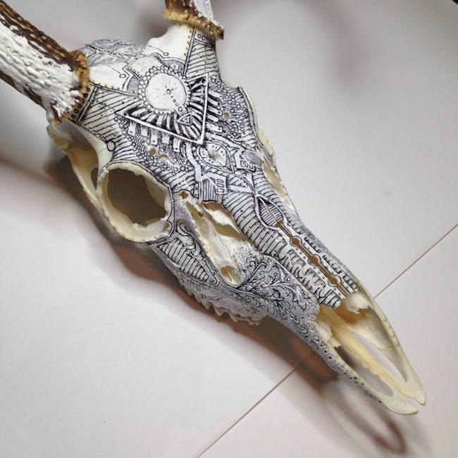 Peter Deligdisch is a 23-year old artist known for his creative doodles. With so much intricate detail, his artwork gives a stunning impression of texture even when drawn on paper. On Youtube, he invites his audience in discovering his artwork in the making, and in his book, Line of Thought, he unveils over 80 of his pieces in an awe-inspiring collection enriched with thought provoking writing. Peter Deligdisch has recently given a new dimension to his artwork by drawing and doing pyrography on animal skulls. The results are exquisite.