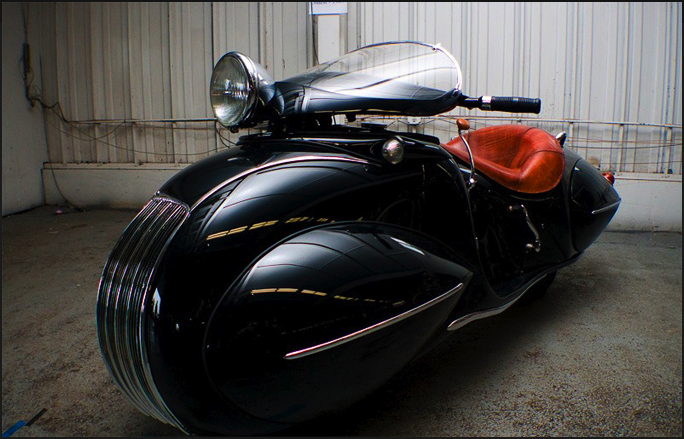 The motorcycling world loves a ‘barn find’—an old, obscure machine wheeled out of the woodwork for the first time. And this is one of the biggest revelations of recent months. It’s a 1930 Henderson that was customized before WW2 by a fellow called O. Ray Courtney and fitted with ‘streamliner’ bodywork. The art deco influence is obvious; legendary automotive designer Harley Earl could have drawn those curves. It’s all the more unusual because the mechanicals are hidden: even at the height of the Art Deco movement, most motorcycles were a triumph of form over function, with exposed cooling fins, brake drums and suspension springs. The bike is owned by collector Frank Westfall of Syracuse.