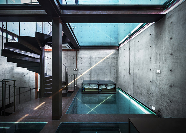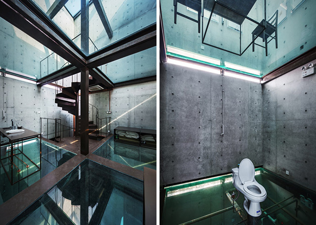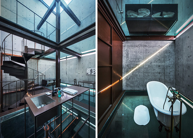 The Vertical Glass House in Shanghai by Chinese firm Atelier FCJZ, the entire house has glass floors instead of windows, so one can peer directly into the downstairs bathroom from the upstairs dining room. Concrete walls are paired with wooden formwork, and each glass floor fits into a pair of narrow horizontal openings in the walls. Extra lighting along these slots generate stripes of light on the building’s façade at night. Designed by Yung Ho Chang as an urban housing prototype for a competition in 1991, the concept was taken to reality as part of the West Bund Biennale of Architecture and Contemporary Art. The Vertical Glass House now serves as a guesthouse for visiting artists and architects.