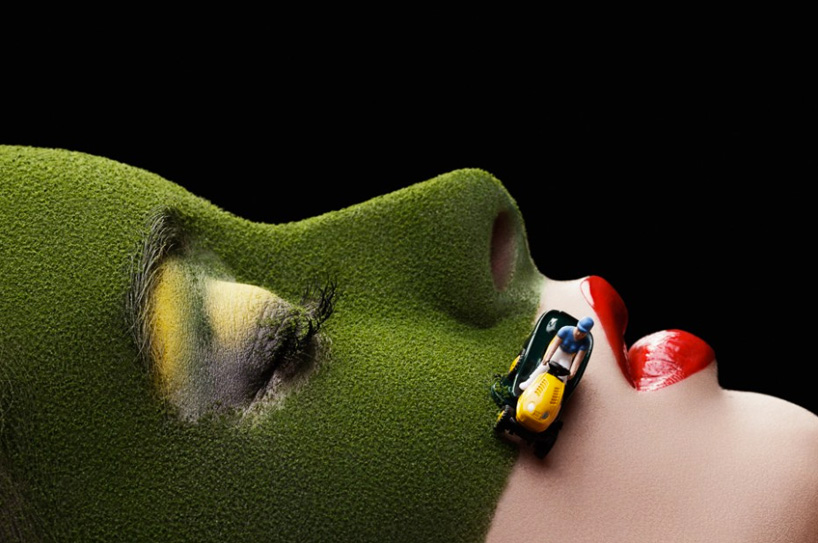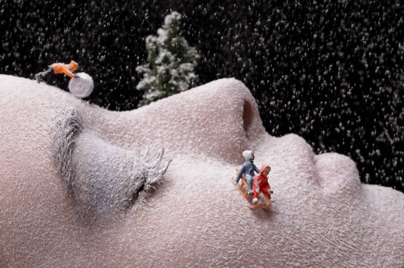 Using miniature figures and makeup, murcia-based photographer juan sánchez castillo creates small landscapes and scenes directly onto the face of a model. ‘Making it up’ comprises a series of photos which animate tiny workers and children interacting with the female’s facial features. In one example, white powder transforms the model’s face into a snowy panorama, as cheekbones become mountaintops and the bridge of a nose visualizes as a steep, snow-covered slope, all the while small-scale characters are pictured sledding and rolling snowballs down the surface of skin. ‘Painters at work’ presents two tiny overall-clad men, attempting to apply color to the giant lips that face them — with part of the lipstick removed, the scene simulates the painter’s work in progress. Each vignette presents a combination of body art and miniatures, creating imaginative and whimsical compositions.