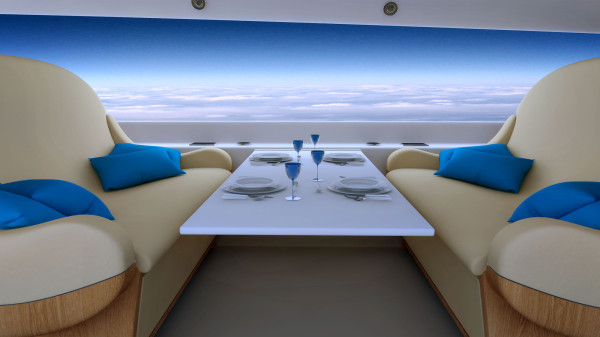 Take a look at what the future of luxury air travel may look like, with renderings of the supersonic jet S-512 by Spike Aerospace. The Spike S-512 will reach international destinations faster than any jet on the market and break the sound barrier at 1,100 miles per hour (1,770 km/hr) — or Mach 1.6 — roughly halving conventional flight times. And one of the most innovative features of the luxury jet will be the conspicuous absence of windows. Instead, cameras installed on the outside of the aircraft will livestream images back onto high-definition screens that run the length of the inside passenger cabin. When they want some shut-eye, passengers will be able to dim the screens or choose their own digital wallpaper from images stored in the system. All that depends, however, on whether or not the engineers and consultants at Spike Aerospace in Boston can get the project off the ground. The company is hoping to crowdsource $250,000 to fund the second phase of the project, which requires finalizing design details. The deadline to reach their crowdsourcing goal is March 14. While the removal of airplane windows may have been unthinkable before, the advancements of micro-cameras and flat-screen displays will enable engineers to improve both the flight experience and aircraft efficiency: not only will a smooth windowless fuselage reduce aircraft weight, it will also reduce drag.