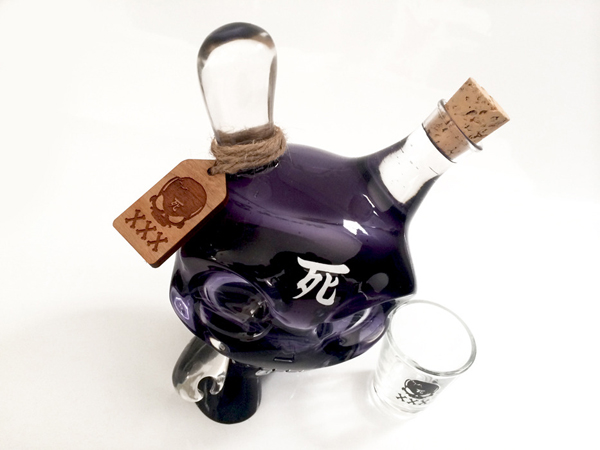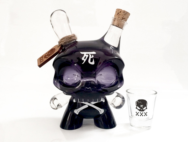 While both Sket and Huck Gee have stellar reputations for their high-end custom editions, they’ve never collaborated on a custom Dunny, well until now. A decade of work has lead to their first collaboration – The Last Drop Dunny. Last Drop is a seductively dangerous concoction, blending Huck’s Skullhead character with Sket’s signature bottle aesthetic from his long-running Dunny condiment series. With a mix of clear and purple translucent materials and tight graphics, this poisonous piece has quite the visual sting. As you’d expect from Huck and Sket, they’ve gone all out on the details including a real cork stopper and a laser etched cherry wood tag. Additionally, the signed/numbered 8″ Dunny comes with a custom screen printed shot glass, and a velour traveling bag.
