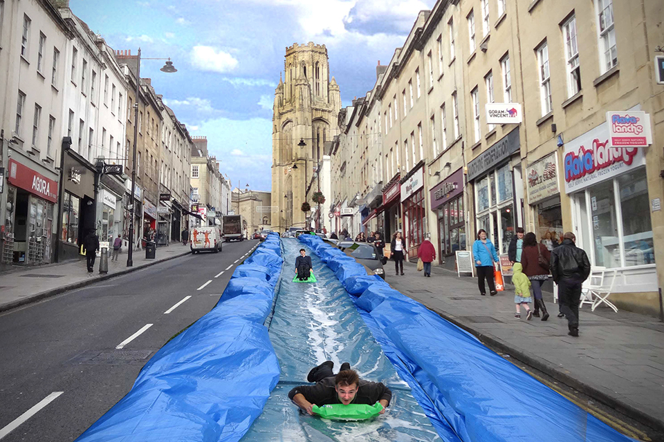 Creating a 300-foot water slide down the middle of a public road sounds like a very American thing to do, but nope. Park and Slide is a crowdfunding project created by artist Luke Jerram that will turn Park Street in Bristol, England, into the coolest city in the world. That’s the goal at least; to shut down the street for a day, build the slide out of plastic sheeting and hay-bales, and open it up to the public—for free. The hills in this southwest England town are plentiful (they’ve been used for soapbox derbies before), so there should be no problem generating speed.