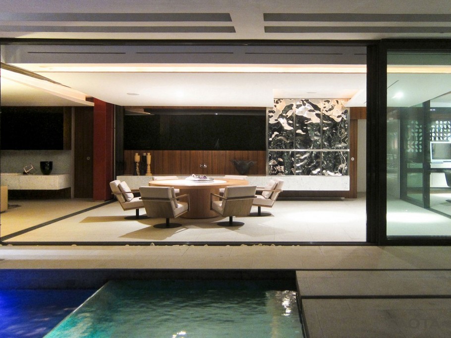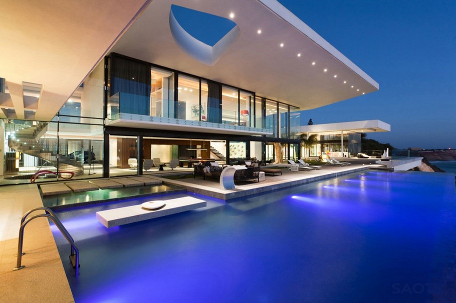 The Villa Sow House is another dream home designed by Stefan Antoni Olmesdahl Truen Architects (SAOTA), a Cape Town-based studio. This two-story contemporary residence is a plush, luxurious home and is located in on a cliff-top in Dakar, Senegal. The exterior of the home exudes contemporary architecture; the sleek, luxury finish of the shining silver material being accentuated through artificial lighting. An incredibly vast swimming pool grabs the focal point of the exterior however, with relaxation, spaciousness and privacy all being combined to create a lavish haven with a terrace/garden-like area. The artificial grass, palm trees and boulder are utilized to generate a feel of modern Eden.