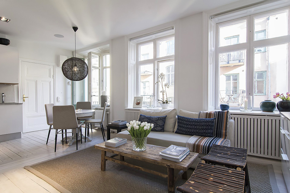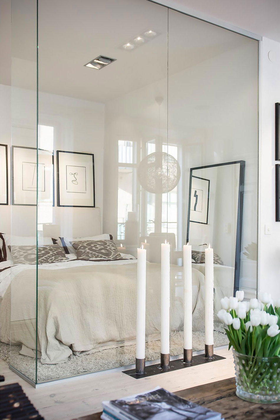 This small apartment in Stockhom, Sweden impressed us with its original layout and stylish decorating scheme. Discovered by Freshome on Svensk Fastighets, the 34 square-meter crib displays comfortable living spaces with a powerful aesthetic appeal. The first interior you are likely to observe upon entering this apartment is the bedroom, creatively separated from the rest of the project through glass walls. Pebbles under the bed, a giant mirror and framed graphics contribute to the Scandinavian personality of this space. A series of accent items such as the coffee table, the candles or the fireplace give the apartment a mixed ambiance, a touch of rusticity and traditionalism, connecting the crib with the historic character of the building. The living zone, kitchen and dining table are organized in an open layout. And when it comes to Scandinavian apartments, an irresistible terrace is a must. In this case, the small balcony extends living spaces, creating a charming venue for having coffee and breakfast during warm summer mornings.