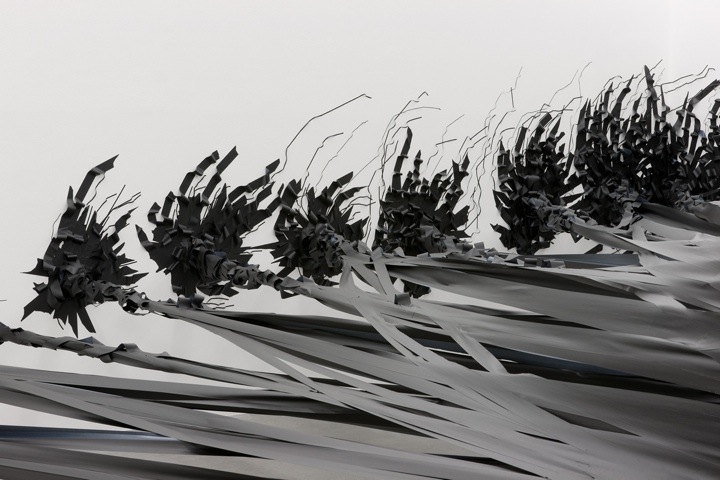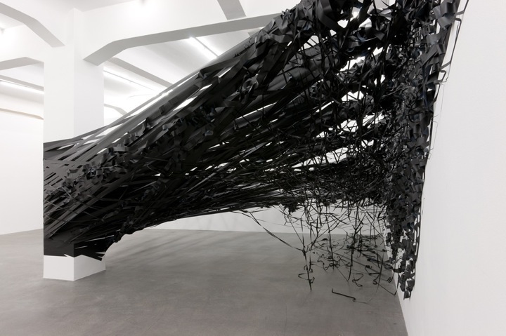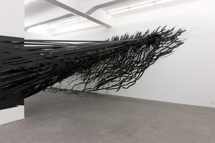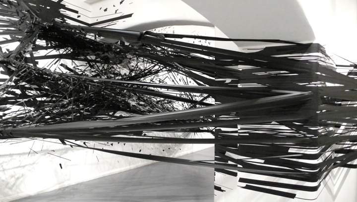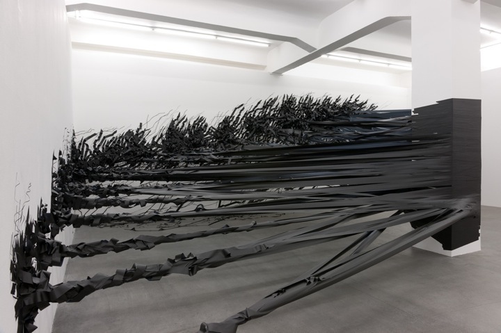 German artist Monika Grzymala`s three-dimensional drawings are taking over the space. For her, drawing is visualized thinking. She is starting her works from scratch, developing huge installations made of black tape that seem to burst on the walls, taking over the gallery space. Grzymala creates vivid artworks that become accessible for the viewer and suggest new perspectives for a usually two-dimensional drawing.