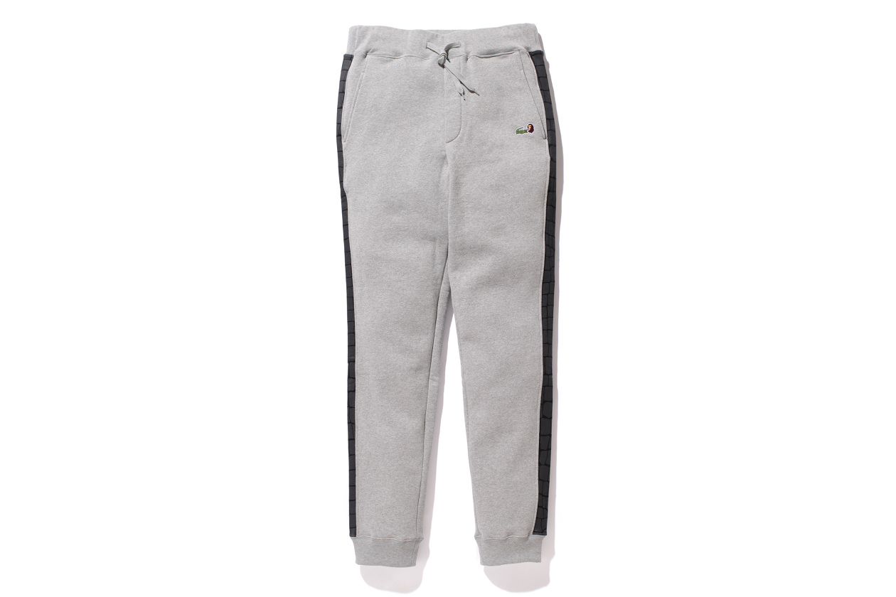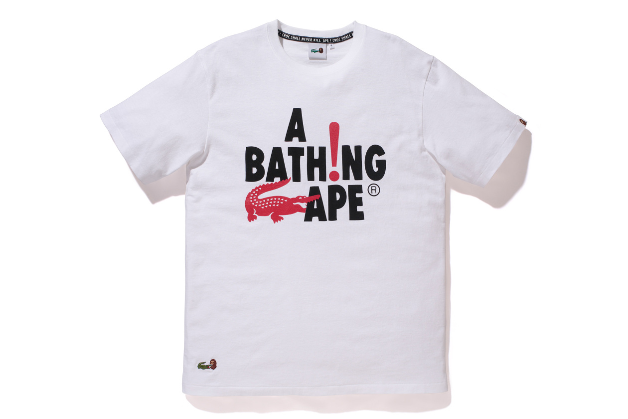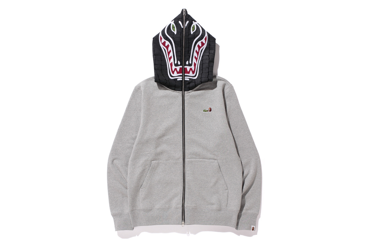 Coming off the heels of their Undefeated collaboration, Bape announces their latest collab with French clothing company Lacoste. The unusual pairing will be an exclusive capsule collection release for the Japanese Bape store. Meshing Bape’s streetwear essence with Lacoste’s luxury-wear, both brands manage to drop one of the better collabs seen this year. The capsule collection consists of polo shirts, sweatpants, hoodies, crewnecks and graphic tees. The full-zip hoodie reimagined as a crocodile is undoubtedly the standout piece from the offerings, while the combined logo offers a clever take on the collaboration, but every piece in the collection will include Lacoste’s signature crocodile logo and Bape’s gorilla logo. The Lacoste L!ve x Bape capsule collection will be available at Japanese Bape locations starting March 28.