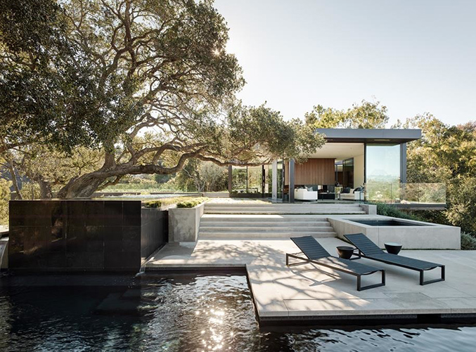The ornate oak trees provide a contrast for the hard edges of the low-lying house – a delicate balance not easily achieved. The use of glass allows for views and vistas over and through the house and makes the mass of the house seem much smaller than it is. Structural concrete is the main building material as it lets large spans of space to flow into each other without columns or supports. All of this leads to a calm harmony between the site and the elegant minimalist house.