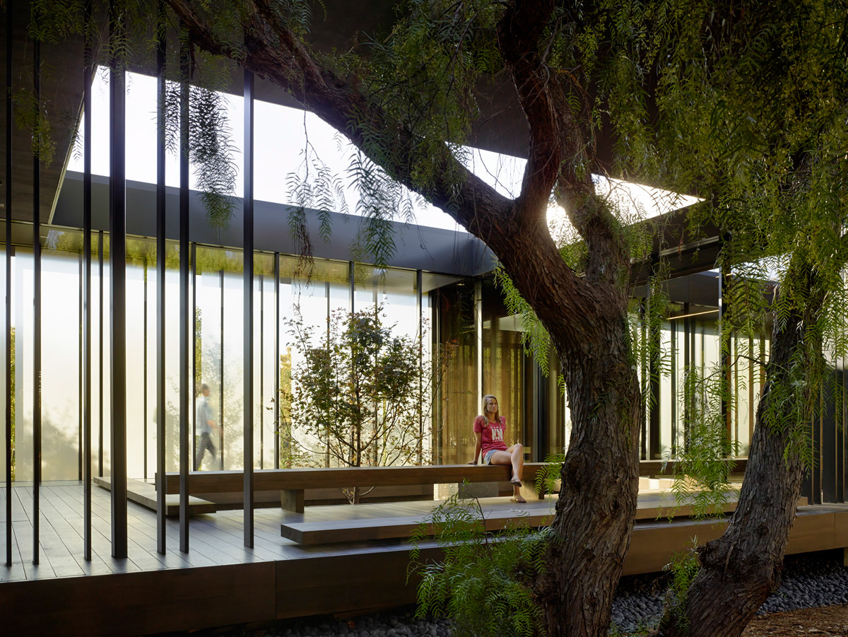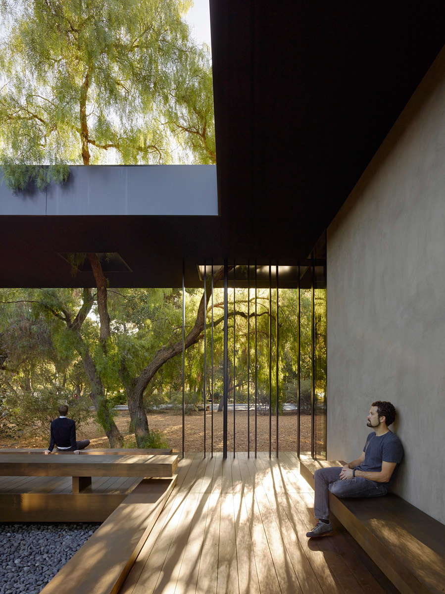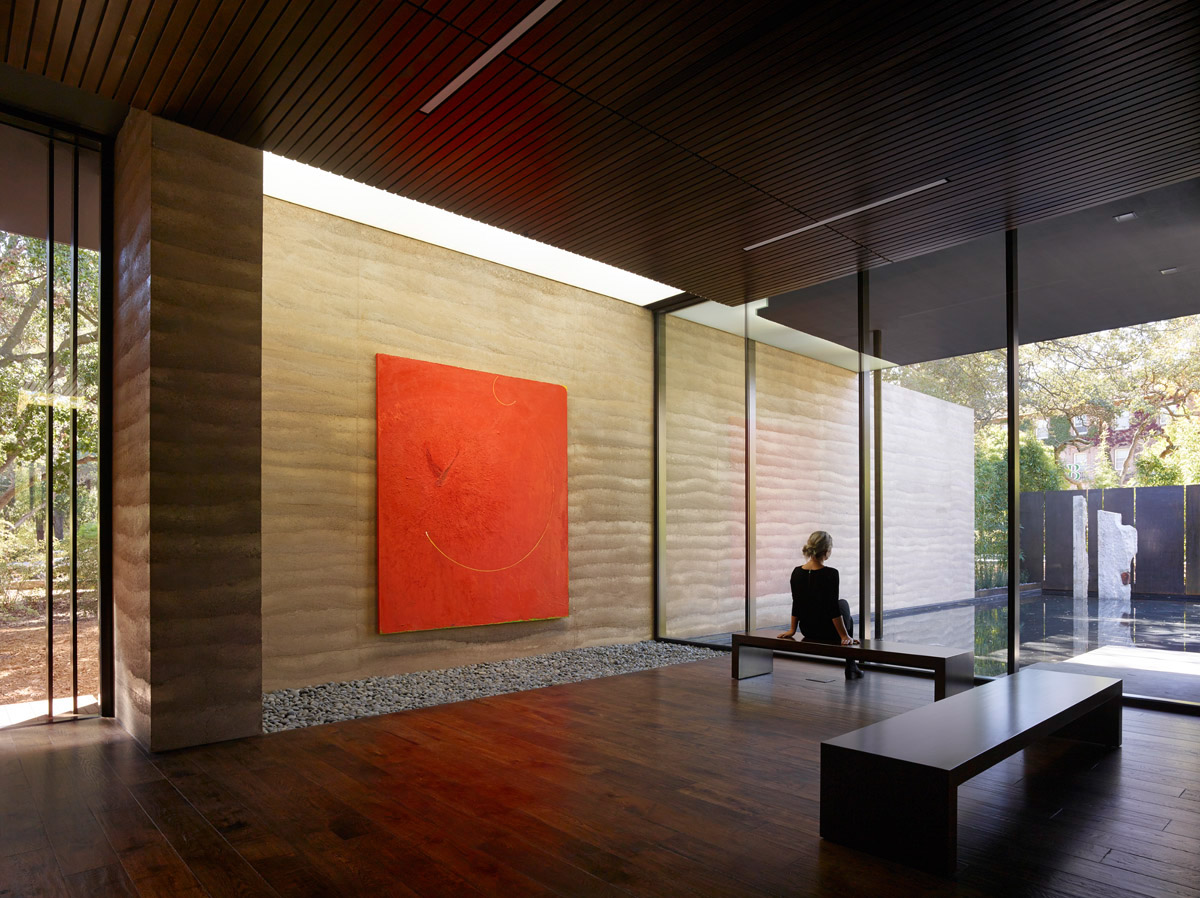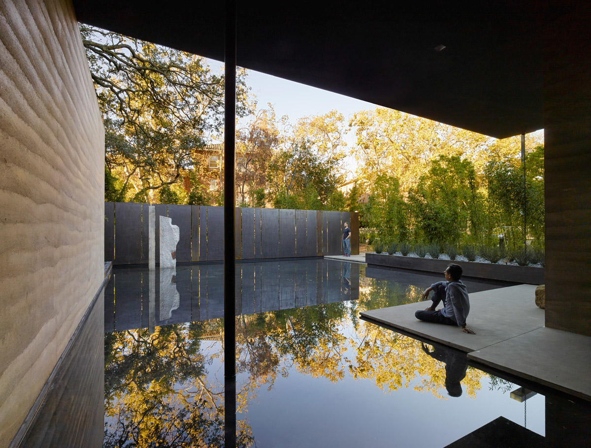 The Windhover Contemplative Center is a spiritual retreat on the Stanford campus to promote and inspire personal renewal. Using Nathan Oliveira’s meditative Windhover Series as a vehicle, the chapel-like center provides a refuge from the intensity of daily life and a space for quiet reflection for the Stanford community. The extended progression through a long, private garden to the building’s entry allows visitors to shed the outside world before entering the sanctuary. Within, the space opens fully to the oak glade beyond while louvered skylights wash the 15 to 30 foot long paintings with natural light, unifying art, architecture and landscape. Rammed earth walls, wood surfaces, and water further heighten the visitor’s sensory experience acoustically, tactily, olifactorily, as well as visually.