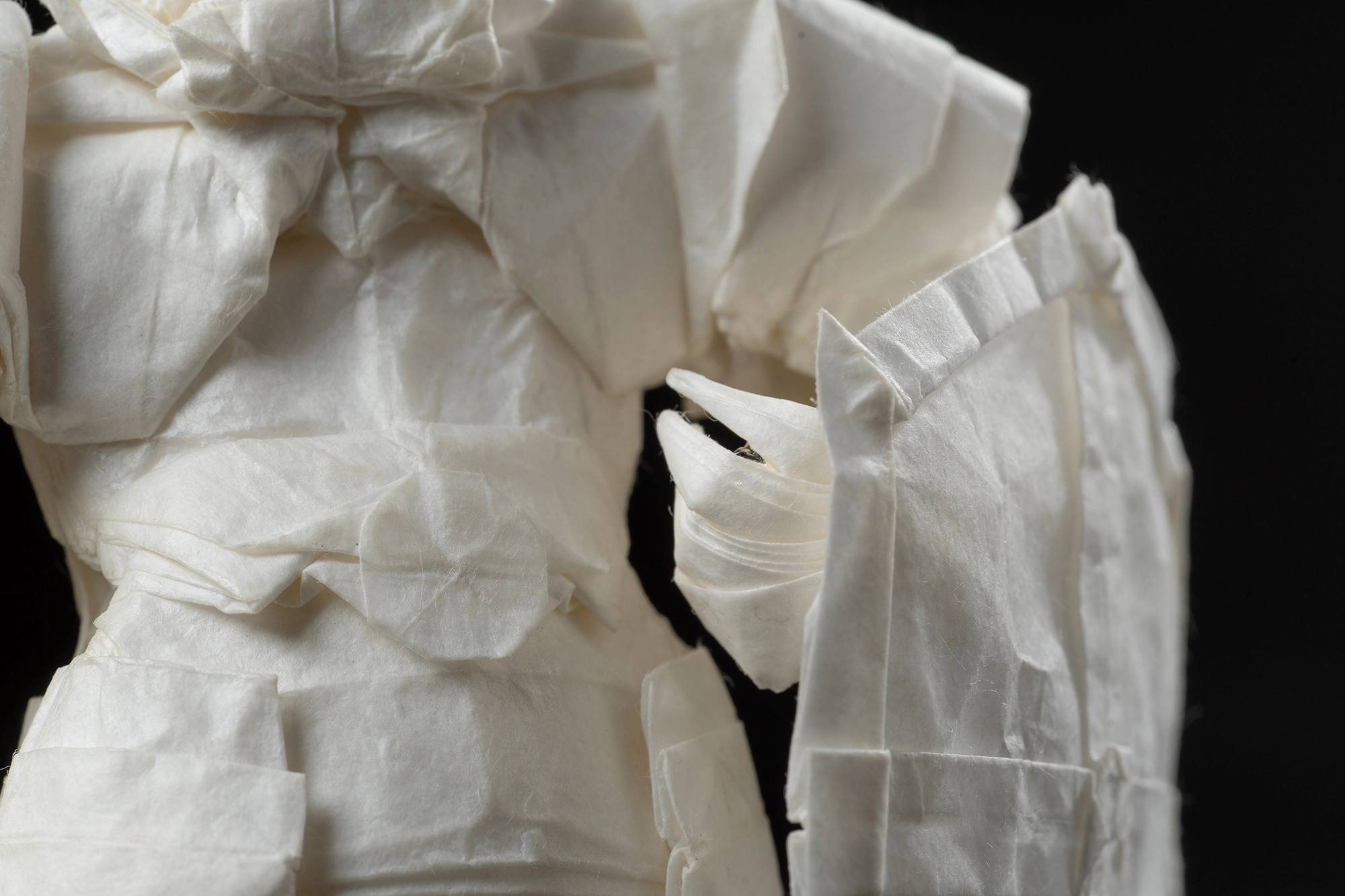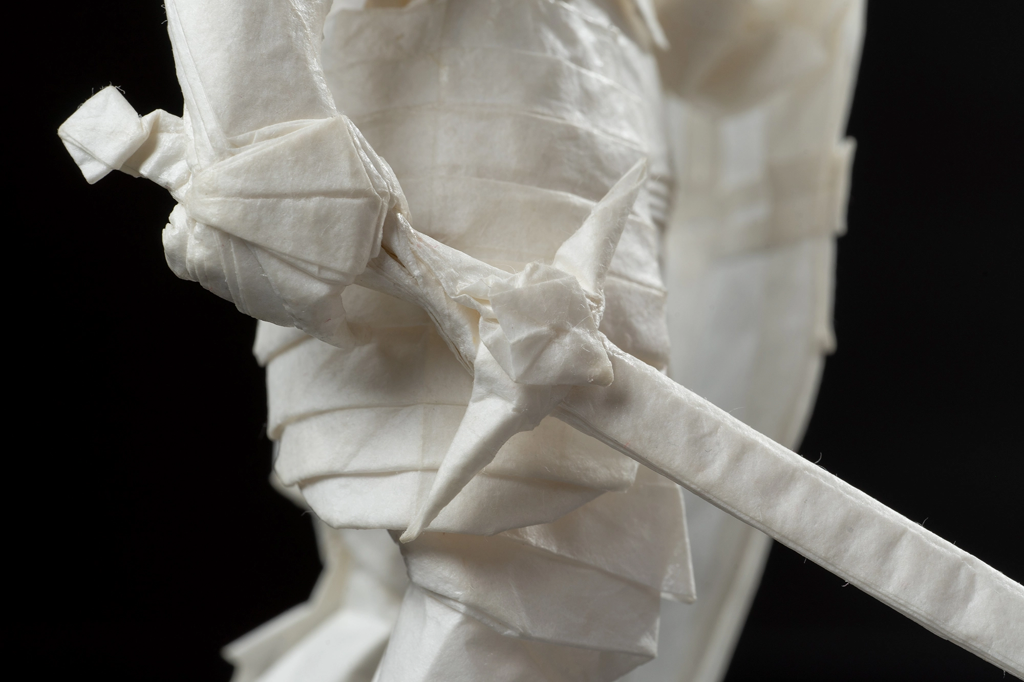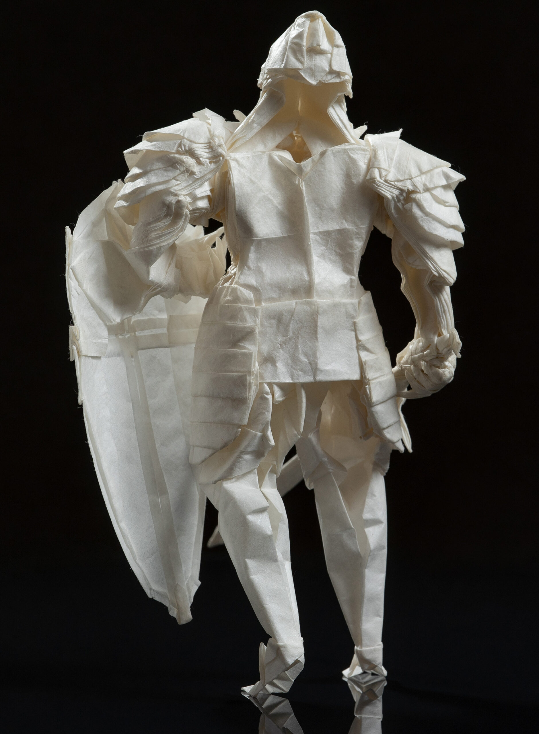 Earlier this year, Finnish artist Juho Könkkölä folded an incredibly elaborate samurai from a single sheet of paper, and now he’s crafted another intricate warrior of his own design. Standing 18 centimeters tall, the sword- and shield-toting figure demanded 41 hours of work using wet and dry origami techniques. Könkkölä started with a 68 x 68-centimeter sheet of Wenzhou rice paper that he scored and folded to capture the protective bands on the shoulders and hips and the exact placement of individual plates. “One of the greatest challenges in this figure was the stark contrast between the shield and the sword; the sword has over 50(!) layers inside the palm of the figure, whereas the shield has only one layer on a large surface,” he writes on Instagram.