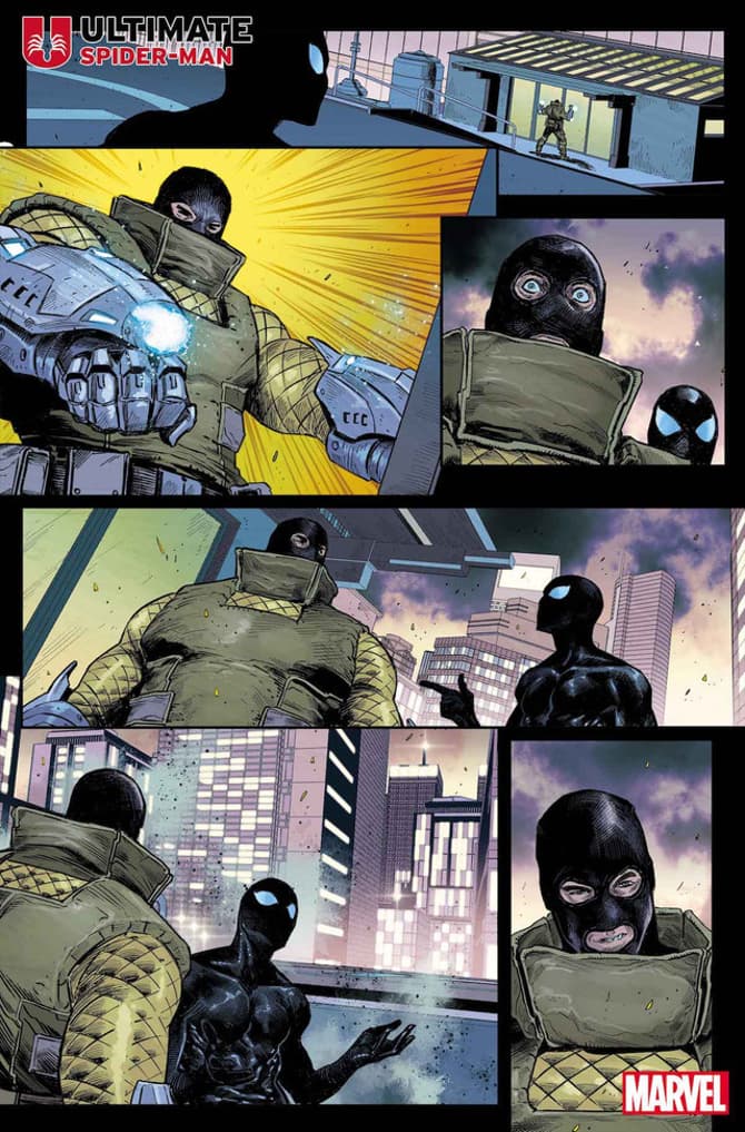 (Outfits, for those non-Urban Dictionary readers). Marvel Comics has released a first look at next month’s Ultimate Spider-Man #2, and while we get to see Peter Parker in action against Shocker, it’s fair to say his new suit isn’t what anyone expected… A few weeks ago Ultimate Spider-Man #1 got everyone talking thanks to the introduction of the Parker family – including a very much alive Uncle Ben – which showed fans just how extraordinarily different Jonathan Hickman and Marco Checchetto’s vision for Spider-Man storytelling is going to be. A new sneak peek at the excitement that lies ahead in February Ultimate Spider-Man #2, but what is Peter Parker wearing? The Ultimate Tony Stark/Iron Lad gifted the older Peter a radioactive spider and “picotech stealth suit” so he could finally fulfil his destiny. The latter looked an awful lot like a Symbiote, and as the wall-crawler heads into action in his all-black get-up, we’d say there’s a very good chance that’s exactly what it is. Covers for the series continue to showcase the classic red and blue, though, so we’re sure that’s coming.