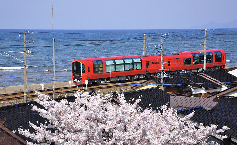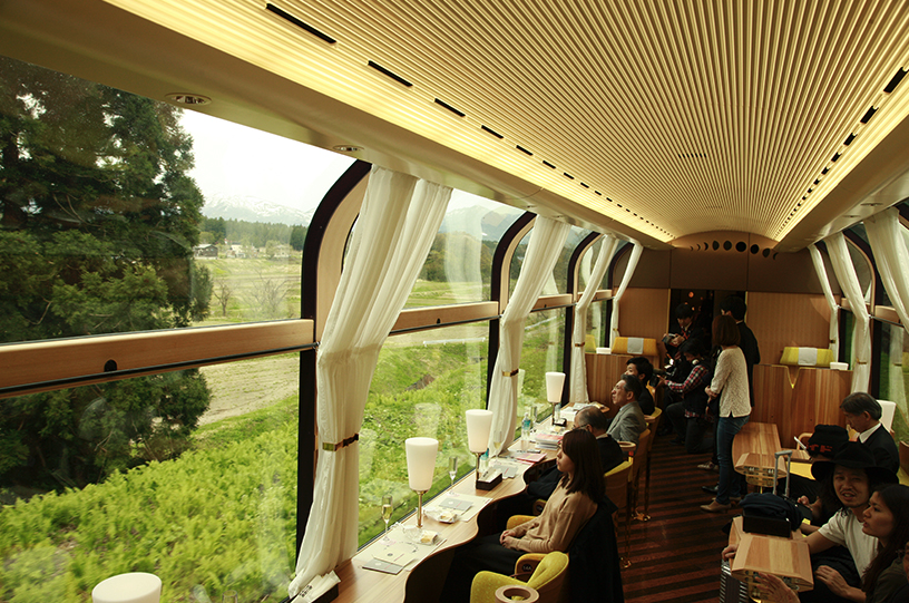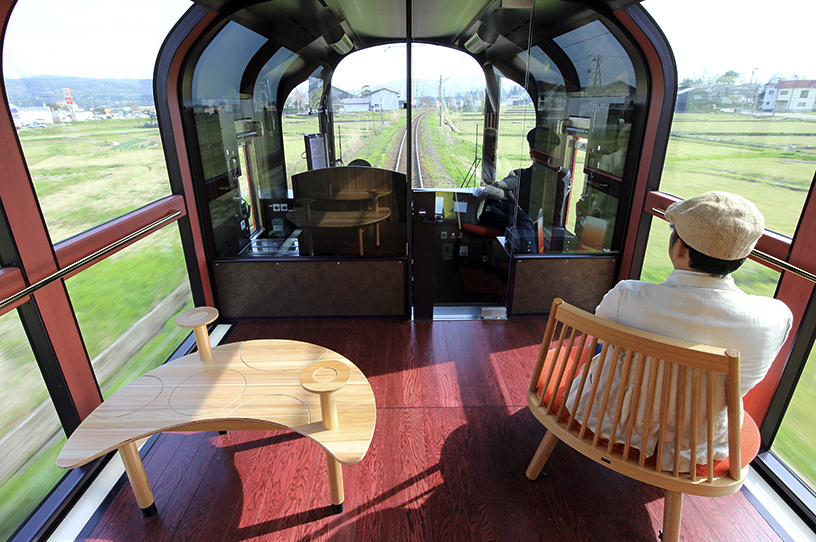 The concept behind the design of the exterior, interior and the experience inside the train was about making it local. To do so, the structure’s body was painted in a vermillion red that allows it to glow with the nature as it moves along the japanese landscape. As for the interiors, the furniture was made of domestic natural lumber and the food in the restaurant includes sake and plates produced with local products. passengers will be part of a one-of-a-kind experience once they ride the train with the largest window in japan, offering views of both the mountains and ocean. Starting its operation in the west part of the niigata prefecture, the locomotive has changed some of its walls for windows, resulting in marvelous views. consisting of only two coaches and 45 seats, the first car is completely dedicated to observation while the second one hosts a french restaurant.