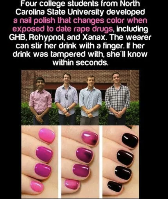 Let us just be clear… the ANTI-Date Rape Nail Polish. The media frenzy erupted following reports that four students from North Carolina had developed a nail polish capable of detecting “date rape” drugs. Allegedly, users could simply dip a finger into a drink and observe a color change, indicating the presence of substances like rohypnol, Xanax, or gamma hydroxybutyrate—commonly associated with date rape incidents. However, the validity of these claims has been met with skepticism.