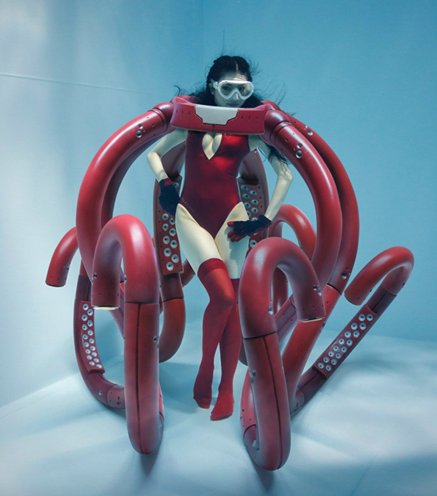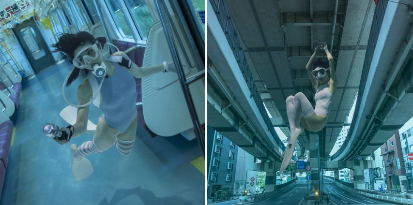 Manabu Koga is a Japanese artist known for his underwater photography. Since the mid-2000s, he’s been creating art by photographing models underwater, offering unique poses and visuals. His recent work combines underwater photography with mecha and character design, featuring models in imaginative costumes. His latest exhibition, JCT, at Clear Gallery in Tokyo, includes striking images like a model floating above a Tokyo street, challenging viewers to think about what’s real and what’s fictional.