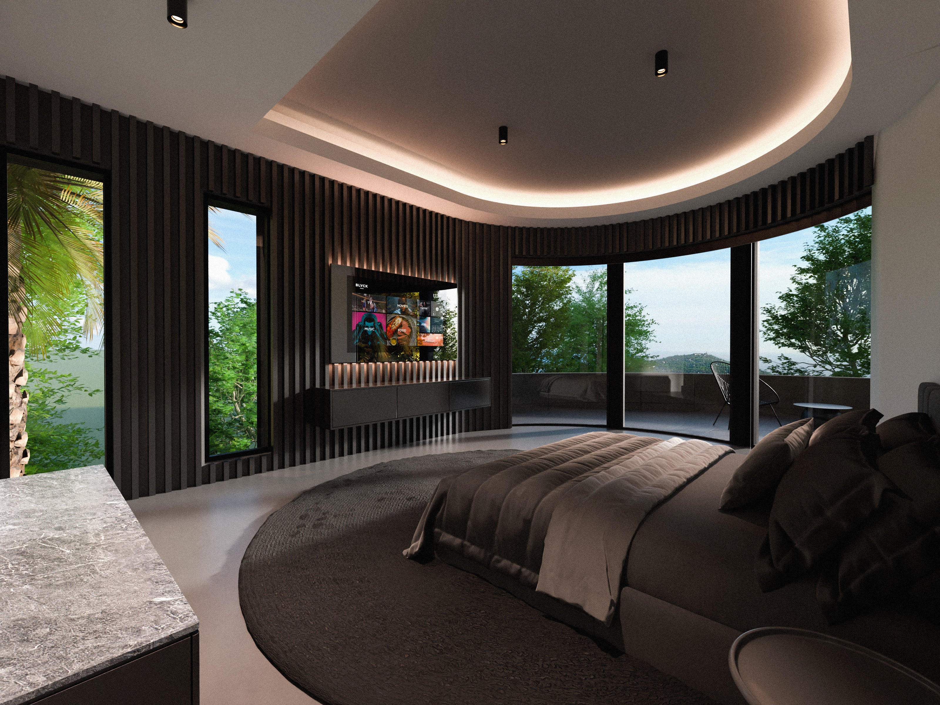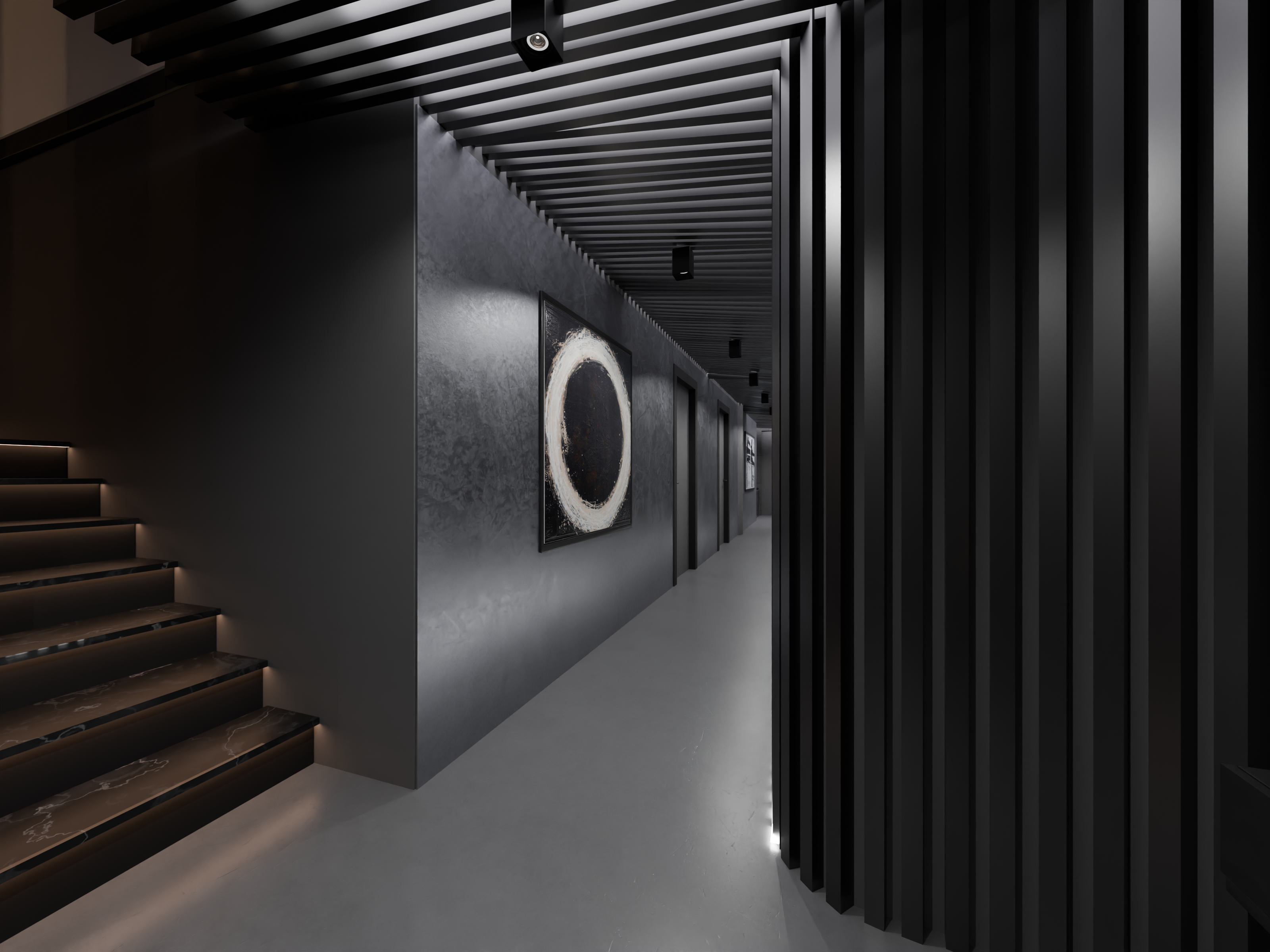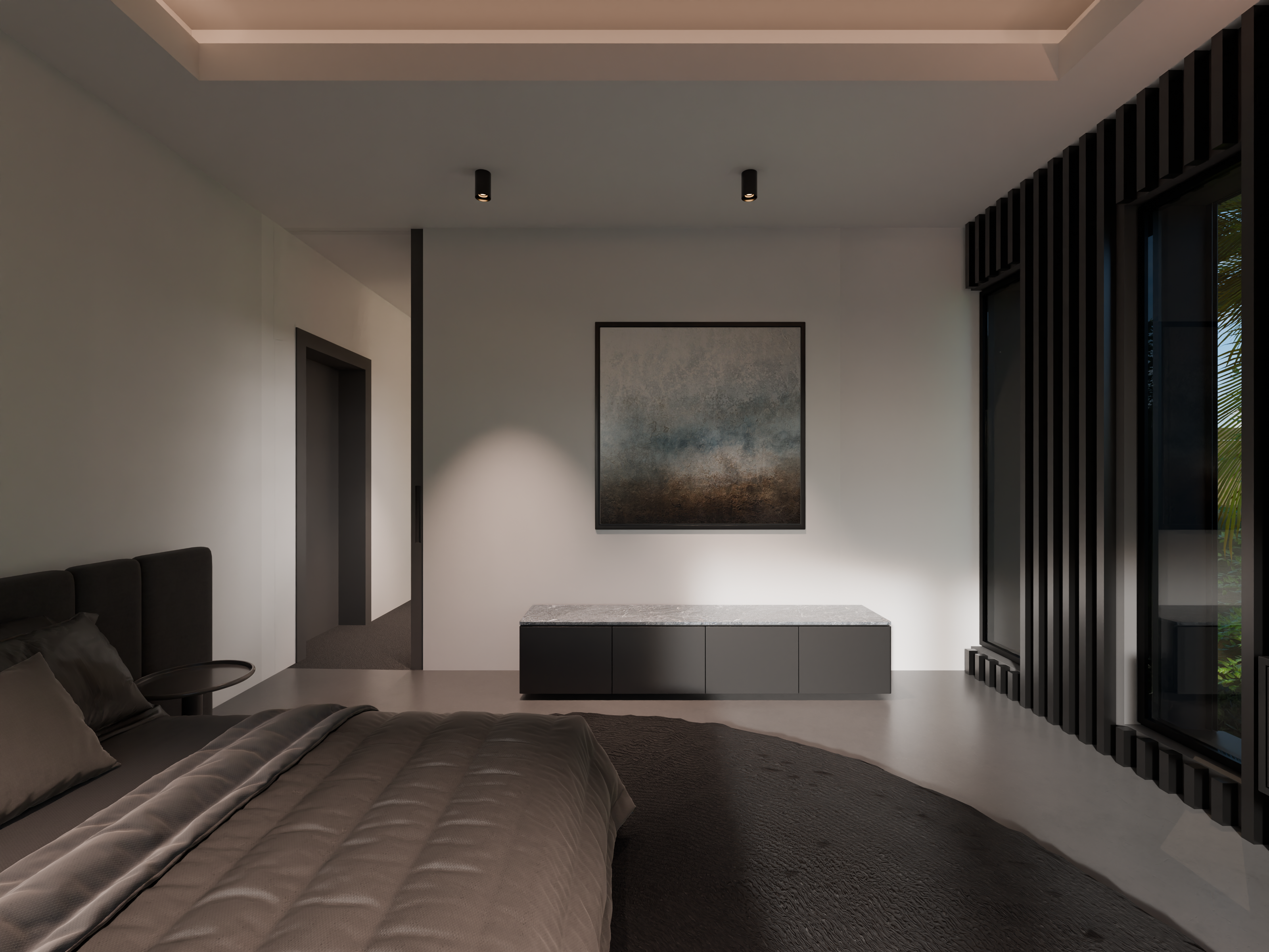 The villa’s design draws inspiration from the tranquil and minimalist style of traditional Japanese architecture. The hallway is characterized by sleek, black linear slats that create a sense of depth and flow. The carefully selected artwork and understated decor enhance the refined elegance of the space, offering a modern yet timeless atmosphere that encourages moments of calm and contemplation. The entrance leads to four tastefully appointed guest rooms, with a cinema and fitness room located at the end.