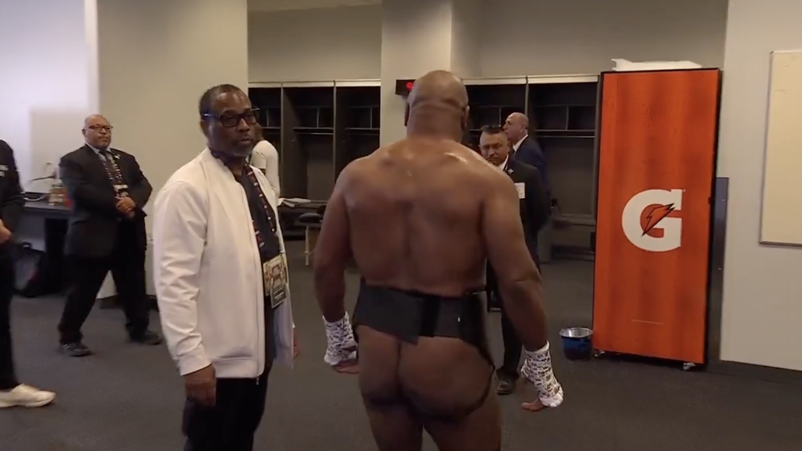Evander Holyfield was able to dodge questions about Tyson’s ear bite ONLY due to the fact that his commentary mic and headset weren’t working as intended, and he ironically had to continuously tap on his bitten ear to try to hear what was being said before he was fed questions vocally. Let’s also just do what we can to briefly cover what wasn’t covered by briefs, (or anything else). After a swift interview with his son, Iron Mike Tyson turned around with his belt on, and not much else. Tyson showing his bare ass will UNDOUBTEDLY go down in pop-culture history as the next biggest wardrobe malfunction past Janet Jackson’s nip slip. But that’s as much attention that we’ll bring to it, you could imagine the rest if there’s anything else to be left to imagination.